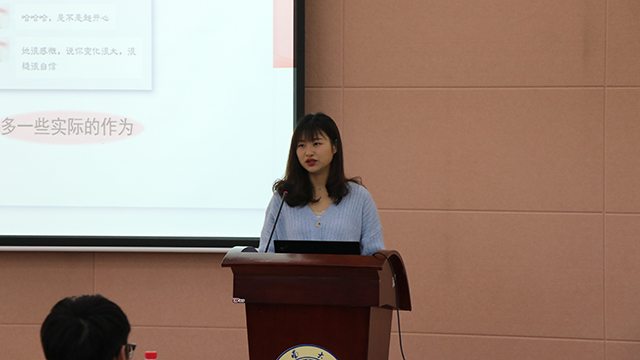 的王钰洁同学向同学们讲述了她的故事。从天生缺陷的低估起步,到如今破茧成蝶的蜕变,王钰洁凭借着自己踏实的勤奋努力,多次获奖学金,同时也荣获全国大学生马克思主义理论学习夏令营优秀营员、韩H漫