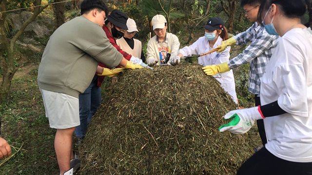 讲解结束后开始堆肥实践活动,同学们根据农场现有物料(杂草、菌包和兔粪),在彭老师的带领下开始堆肥实操。粉碎杂草、科学配比、规则铺设,按照“堆肥5要素”理论一堆标准的堆肥顺利制作完成。在种植区,授课老师张赛指导学生根据《耕作学》课堂所学理论,从作物种类选择,提前进行作物布局、自行购买种子(种苗)、到当天的整地和播种。学生们学习到不同作物搭配的原则、栽种的技术,通过实践活动提升动手能力,将课本上的专业知识应用于现实。