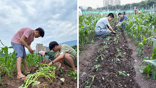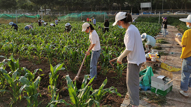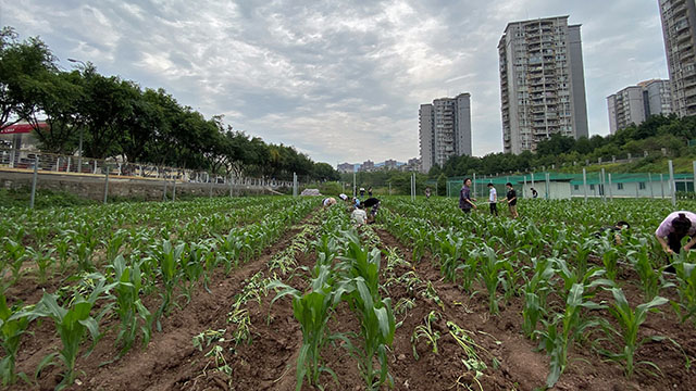 中午刚完成生产实践的潘杉同学觉得自己对于挖沟起垄的操作技术比去年更加熟练,结束后更感到劳动的满足和愉悦。半天的实践下来,她不仅熟悉了各项农事操作技术,也学到了田间生产的知识。例如种植甘薯时要注意起垄要大、直且圆,设置适当的肥料梯度有利于我们研究不同的肥料浓度对玉米和甘薯的生长发育和产量的影响等。她说:“我觉得这样的实践对于农学学生来说是必不可少的。当我们自己体验过作物种植的准备工作、实地操作、田间管理、产量分析以及解决相关问题后,我们才能更好地去理解我们在课堂上所学习的基础理论知识。”除此之外,基地的土地在同学们未返校前就已经请工人打理过,翠绿的玉米苗在平整的土地上更显生机,潘杉希望以后在不断学习新知识的同时,可以在这门课上种植更多的作物品种,了解更多的农业知识。