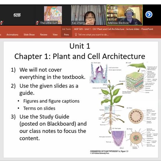 5月6日,由密苏里州立大学(MSU)给2019级植科专业讲授的第1门专业类课程Plant Structure and Function(AGP 323.750)正式开课。受全球疫情的持续影响,原计划的线下课程调整为了线上模式,课程由MSU副教授Melissa Bledsoe博士主讲,我校张凯副研究员作为该课程的共课老师。