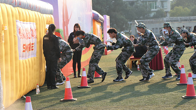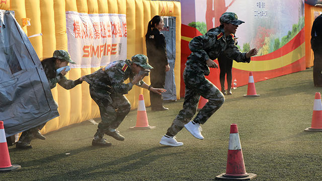 比赛的最后一部分为疏散逃生,参赛同学用毛巾捂住口鼻,弯腰低姿、快速有序地穿过模拟烟雾逃生体验馆。韩H漫选手队列有序,动作标准,完美地完成了此项比赛。