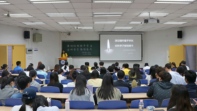 党委副书记郑莉佳老师向同学们宣读了《袁隆平同志生平》,并强调袁隆平院士一生刻苦求学,教书育人,发表论文,发表专著,不求名利,只为了两个梦:一个是禾下乘凉梦,一个是杂交水稻覆盖全球梦,希望我们农科学子能秉承他的遗志,继续努力实现这两个梦想。