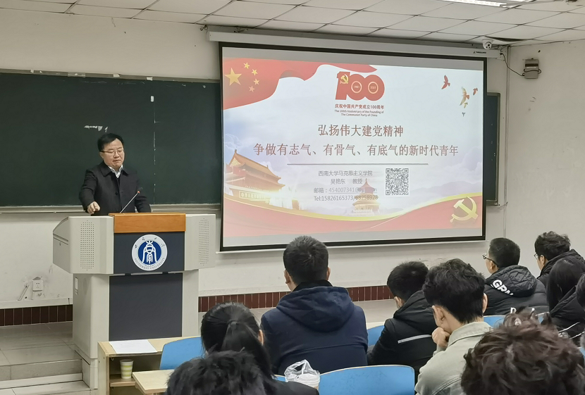 副院长吴艳东教授以《弘扬伟大建党精神 争做有志气有骨气有底气的新时代青年》为题,为全体学员讲授了生动的第一课。