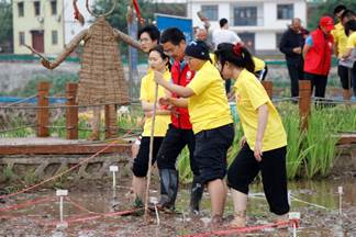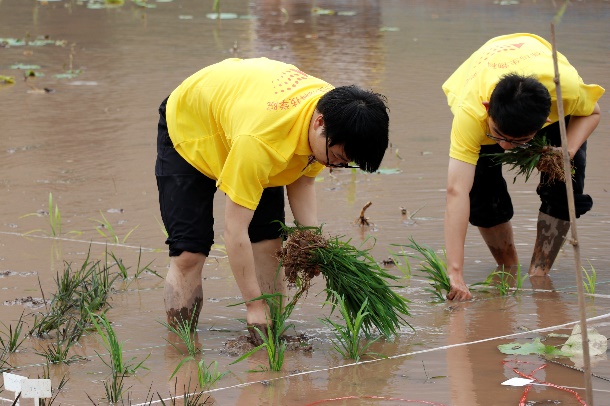 烈日当空,学生们一改书生意气,将书本中的知识转化为实践操作能力,纷纷卷起裤腿下田开展插秧劳动,经过2个多小时的劳作,秧苗整整齐齐地插在水田里。张院长介绍道,等到秋风吹起时,田地里的穗稻便会组成一幅“旭日东升”图。
