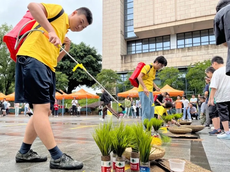 “春种秋收”活动中,在明媚的阳光下,学生队和教师队两支队伍轮番参与合作接力游戏。队员们快速穿越场地,运输土壤、播种、插秧、浇灌、施药,紧密协作,场面热闹非凡。观众的欢呼声和加油声充斥着整个场地,营造出紧张而充满活力的氛围。