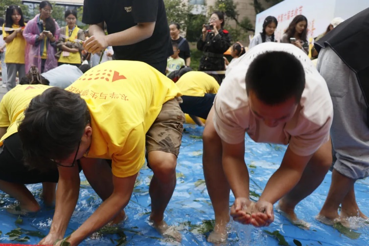 在“浑水摸鱼”比赛现场,参赛的队伍汇聚在室内人造池塘旁。比赛开始,计时器滴答作响,队员们迅速伸手进水,紧抓泥鳅和鲤鱼,然后迅速递到场外的水桶内,泥鳅积2分,鲤鱼加1分。紧张的两分钟内,积分不断上涨,观众和队员们都紧盯着比分牌,争夺胜利。观众们无不感到兴奋,侥幸脱手的鲤鱼飞跃至空中,惊起了一片尖叫声。