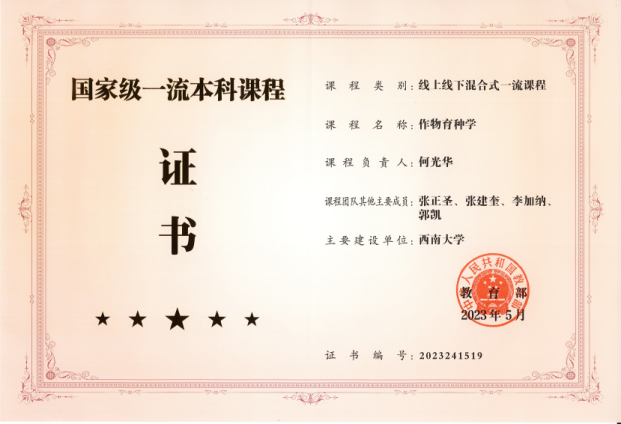 作物育种学课程还于2019年被评为重庆市高校精品在线开放课程,2020年入选重庆市一流本科课程(线上线下混合式)。