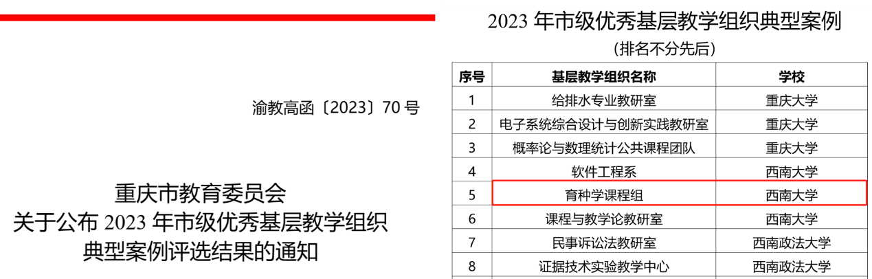 (育种学课程组获评2023年市级优秀基层教学组织)