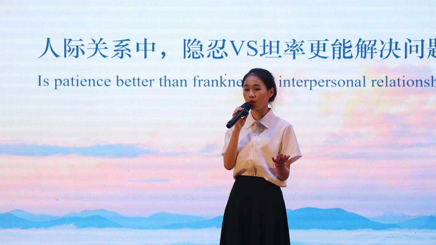 比赛主要分为三个赛道,分别是个人演讲赛道、班级展演赛道以及书法赛道,比赛期间设有英语绕口令等互动环节,整场比赛惊喜不断,欢呼不断。裁判组组长Joshua Conaway致辞后,六位选手分别上台演讲,演讲主题为“In relationships, it's better to hold back or to be honest”(人际关系中, 隐忍还是坦率更能解决问题)。每位选手在五到八分钟内完成自己的演讲,由台下评委随机抽取相关问题并向选手提问,选手需要在一分钟内做好准备并作答,整个环节紧张刺激,非常考验选手的逻辑思考能力和表达能力,以及选手的心理素质。在个人演讲过程中,参赛的选手们均展现出了卓越的表现力和扎实的语言功底。他们的表现不仅赢得了评委和观众的高度评价,也充分体现了他们在语言学习和文化交流方面的深厚实力。