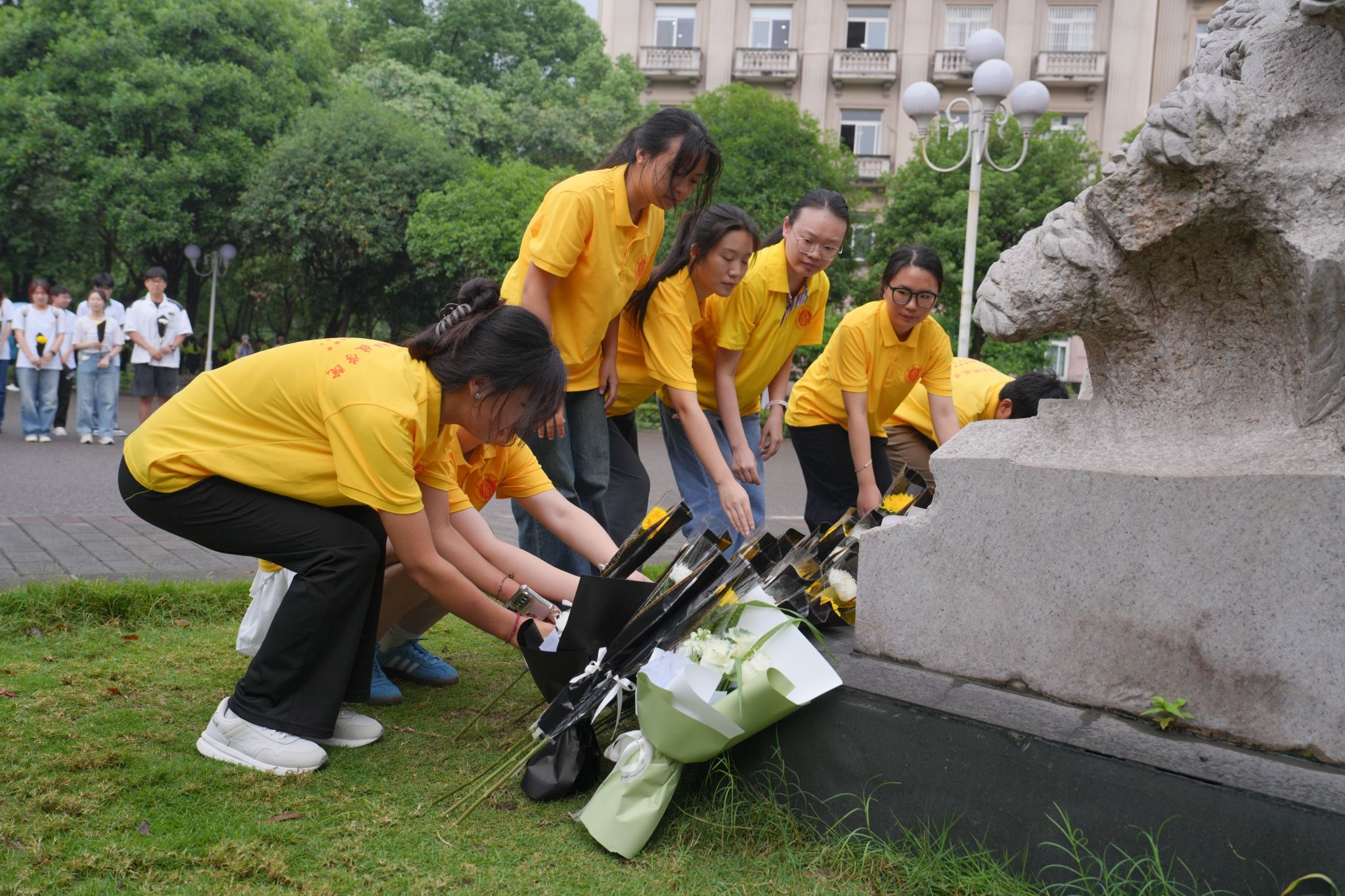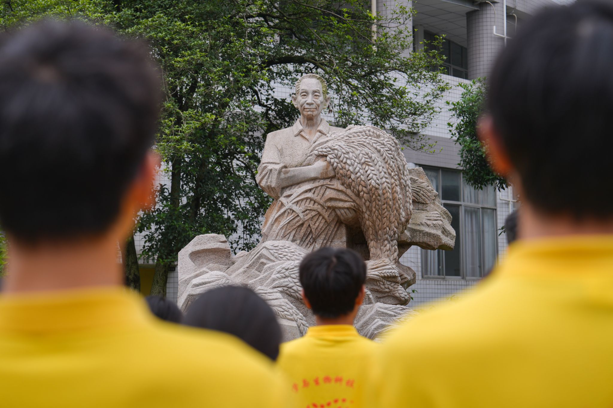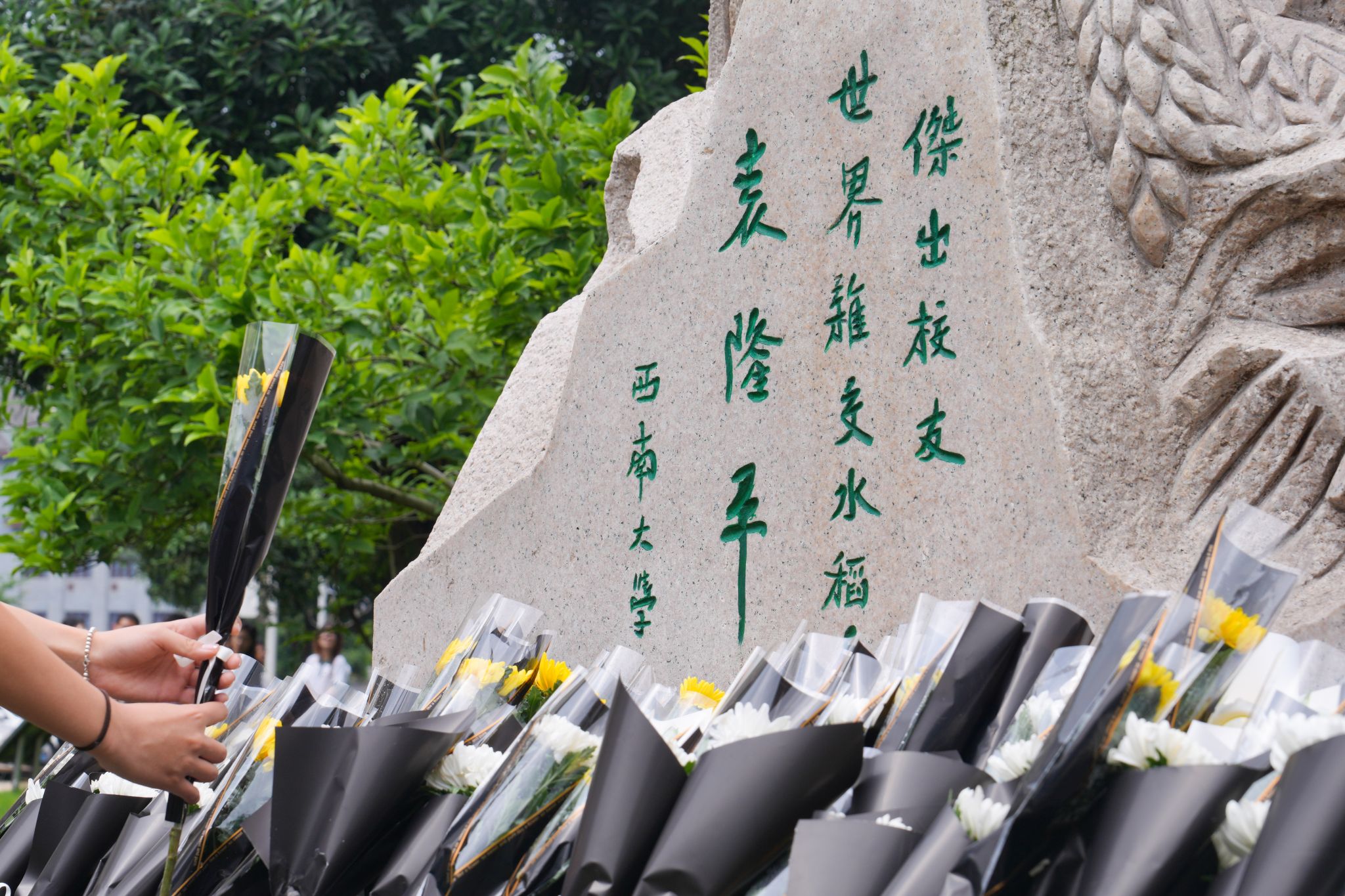 32教学楼前的袁隆平雕像处敬献鲜花、深切缅怀。韩H漫