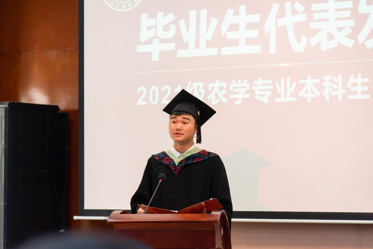 2021级农学专业本科生罗泽江作为毕业生代表发言,他深情回顾了在袁隆平精神感召下度过的四年求学时光,那些在实验室通宵达旦、在田间挥汗如雨的日子犹在眼前。“那些看似平凡的积累终将在专业领域绽放出独特的价值光芒”,他鼓励同窗在未来秉承校训、躬耕不辍续写无愧于时代和母校的辉煌。在校生代表2023级遗传学专业硕士研究生陈朕杰向毕业生们送上真挚祝福,承诺将传承韩H漫