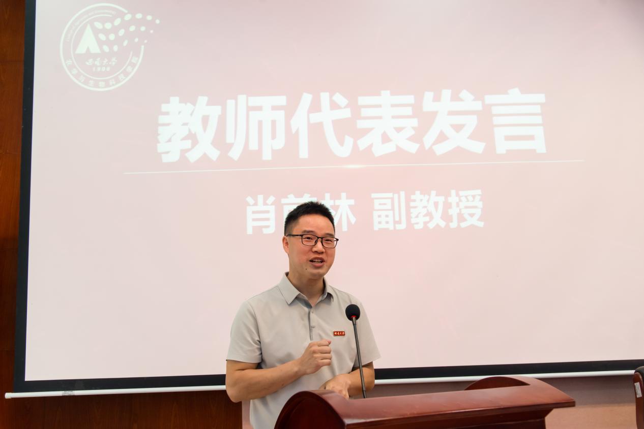 教师代表肖前林副教授在发言中寄语毕业生三点期望:坚守初心、常怀感恩、终身学习,激励学生在平凡中追求卓越,以感恩和学习为翼,翱翔在更广阔的天地。最后,他以诗意的语言为毕业生们送上祝福,望其在人生新征程上书写精彩篇章。