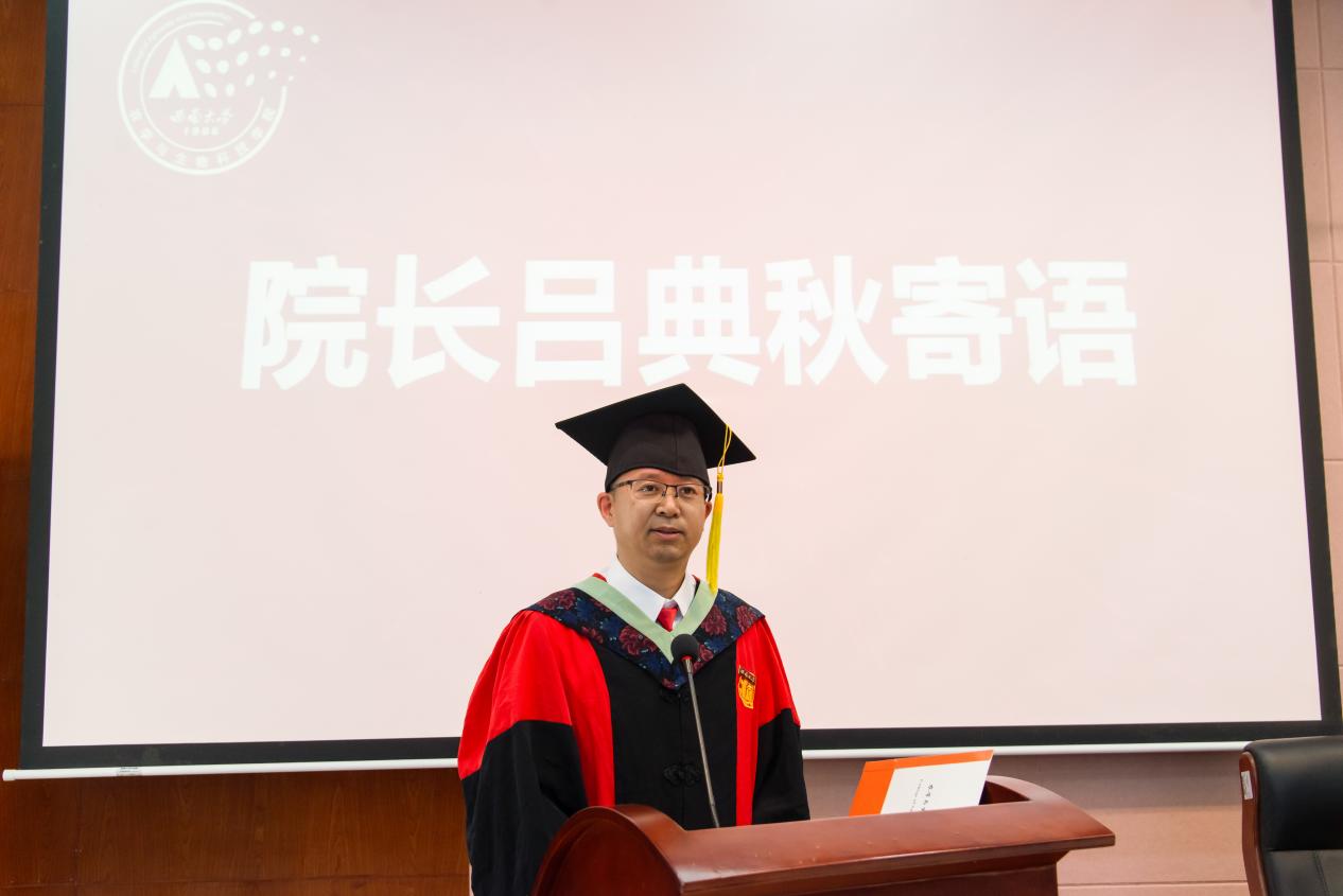 院长吕典秋在致辞中高度肯定了本届毕业生取得的优异成绩。本届本科毕业生升学率达56.36%,124人被北京大学、中国科韩H漫