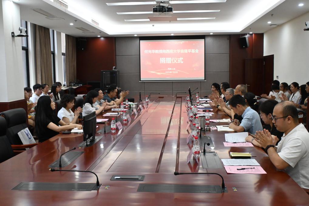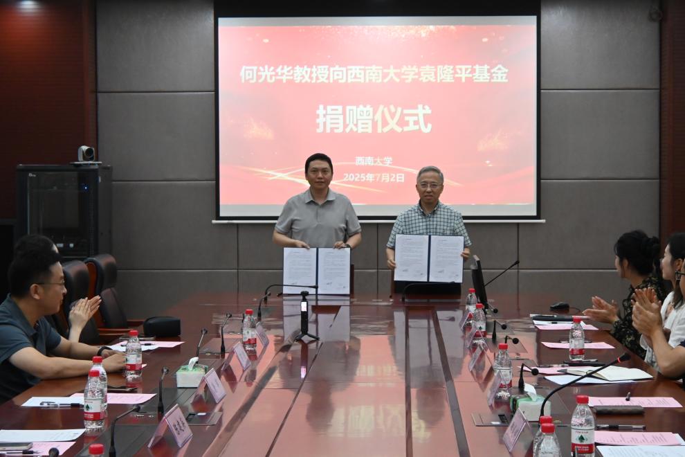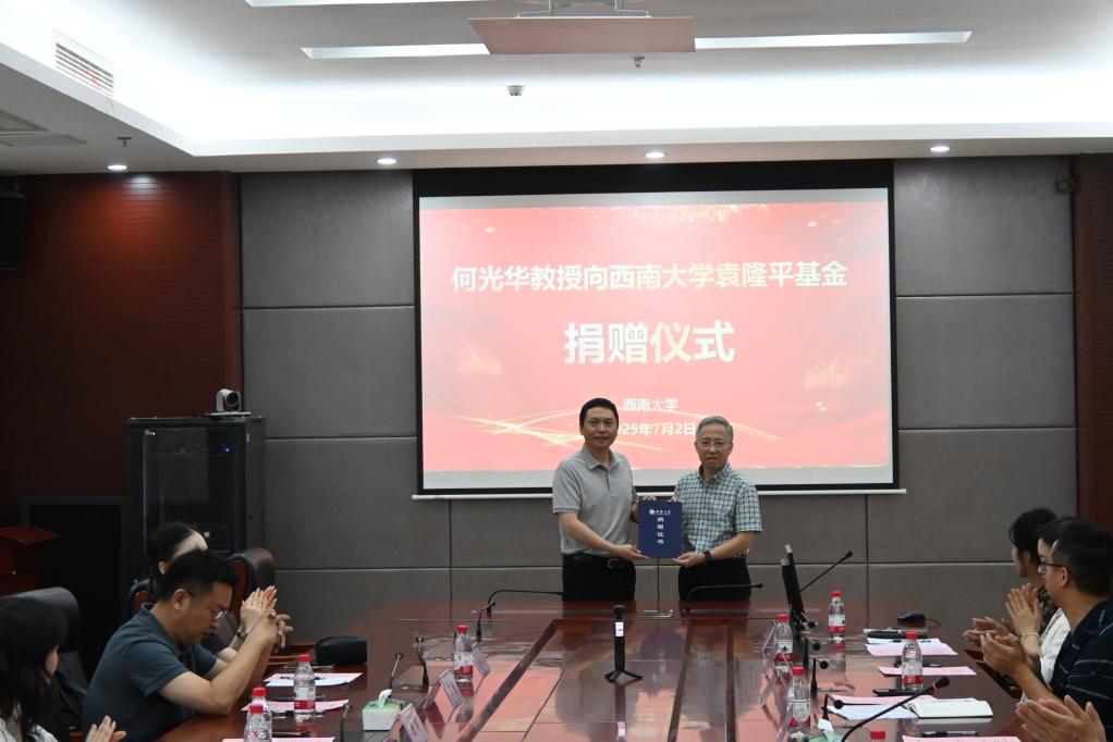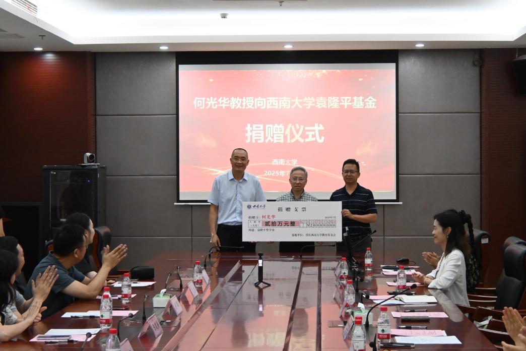 何光华教授在发言中表达了对袁隆平院士的深切缅怀,他强调:“袁隆平院士不仅是农生师生的榜样,也是西大的名片;他是中国的,更是全世界的。”此次捐赠20万元注入袁隆平奖学金,旨在激励青年农科学子传承袁隆平精神,学习其“胸怀祖国、勇于创新、团队合作、乐观向上”的品质,并呼吁发动校友资源扩大捐赠规模,提升袁隆平奖学金的影响力。