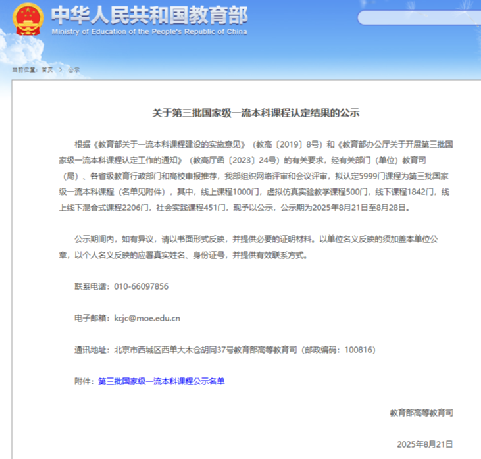 国家级一流课程:累计2门课程获评国家级一流本科课程,覆盖线上线下混合式、社会实践类两大类别;