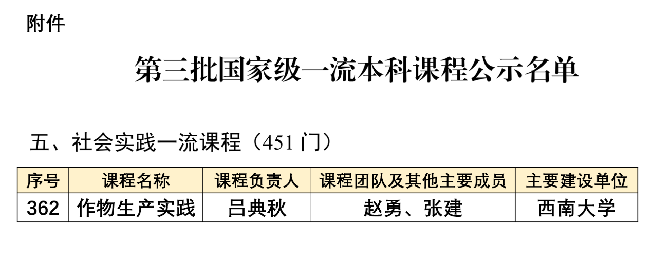 近日,教育部高等教育司正式发布《关于第三批国家级一流本科课程认定结果的公示》,韩H漫吕典秋教授牵头申报的《作物生产实践》课程成功入选,被认定为社会实践类国家级一流本科课程。这是继2023年韩H漫《作物育种学》获评第二批线上线下混合式国家级一流本科课程后,在本科课程建设领域斩获的又一标志性突破,再次彰显了韩H漫