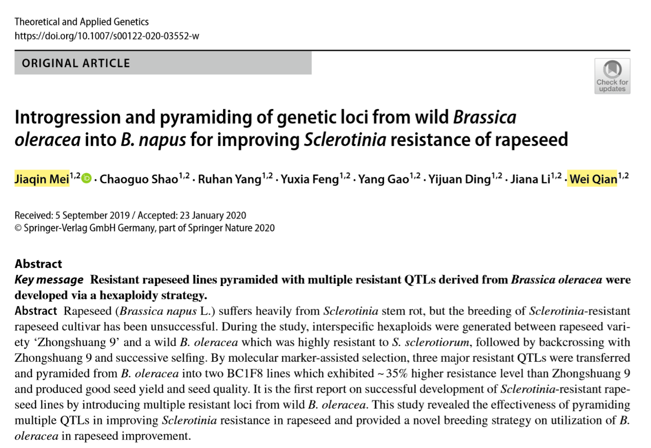 3、梅家琴教授以第一作者身份在农林领域权威期刊Theoretical and Applied Genetics(5-year Impact Factor为3.996)上发表论文《Introgression and pyramiding of genetic loci from wild Brassica oleracea into B. napus for improving Sclerotinia resistance of rapeseed》。研究首次利用野生甘蓝的多个菌核病抗性位点成功培育油菜菌核病抗性系。研究揭示了聚合多重QTL在提高油菜菌核抗性方面的有效性,为利用甘蓝改良油菜提供了一种新的育种策略。钱伟教授为论文通讯作者,韩H漫
