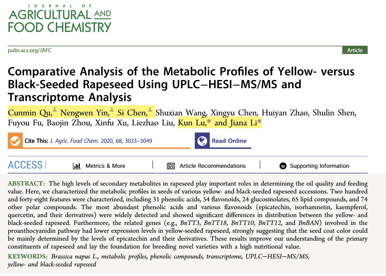 2、曲存民副教授以第一作者身份在农林领域权威期刊Journal of Agricultural and Food Chemistry(5-year Impact Factor为3.911)上发表论文《Comparative Analysis of the Metabolic Profiles of Yellow- versus Black-Seeded Rapeseed Using UPLC−HESI−MS/MS and Transcriptome Analysis》。研究鉴定了黑籽和黄籽油菜248种代谢组分,发现原花青素途径的相关基因在黄籽油菜籽中表达水平较低,说明籽粒颜色主要由表儿茶素及其衍生物的水平决定。结果为培育营养价值高的新品种奠定了基础。卢坤教授和李加纳教授为论文的共同通讯作者,韩H漫