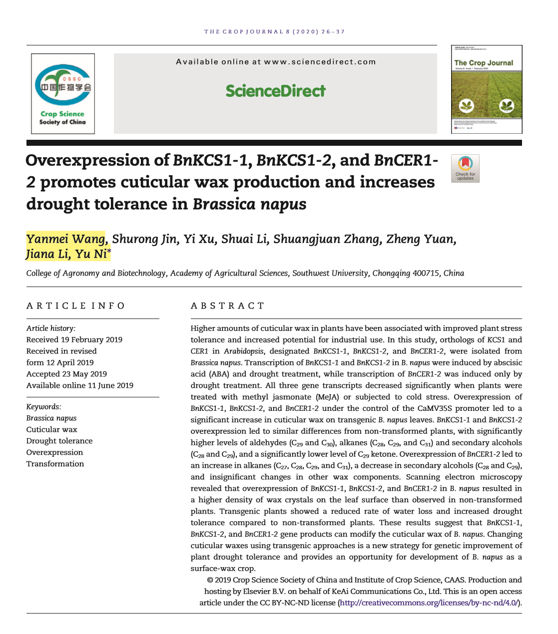 4、硕士生王艳玫以第一作者身份在农林领域权威期刊The Crop Journal (2018 Impact Factor为3.179)上发表研究论文《Overexpression of BnKCS1-1,BnKCS1-2, and BnCER12 promotes cuticular wax production and increases drought tolerance in Brassica napus》。研究发现过表达BnKCS1-1、BnKCS1-2和BnCER1-2导致转基因油菜叶片表面蜡晶密度高于对照,转基因植株失水率降低,耐旱性增强。结果为油菜作为一种表面蜡质作物的开发提供了契机。倪郁教授为论文通讯作者,韩H漫