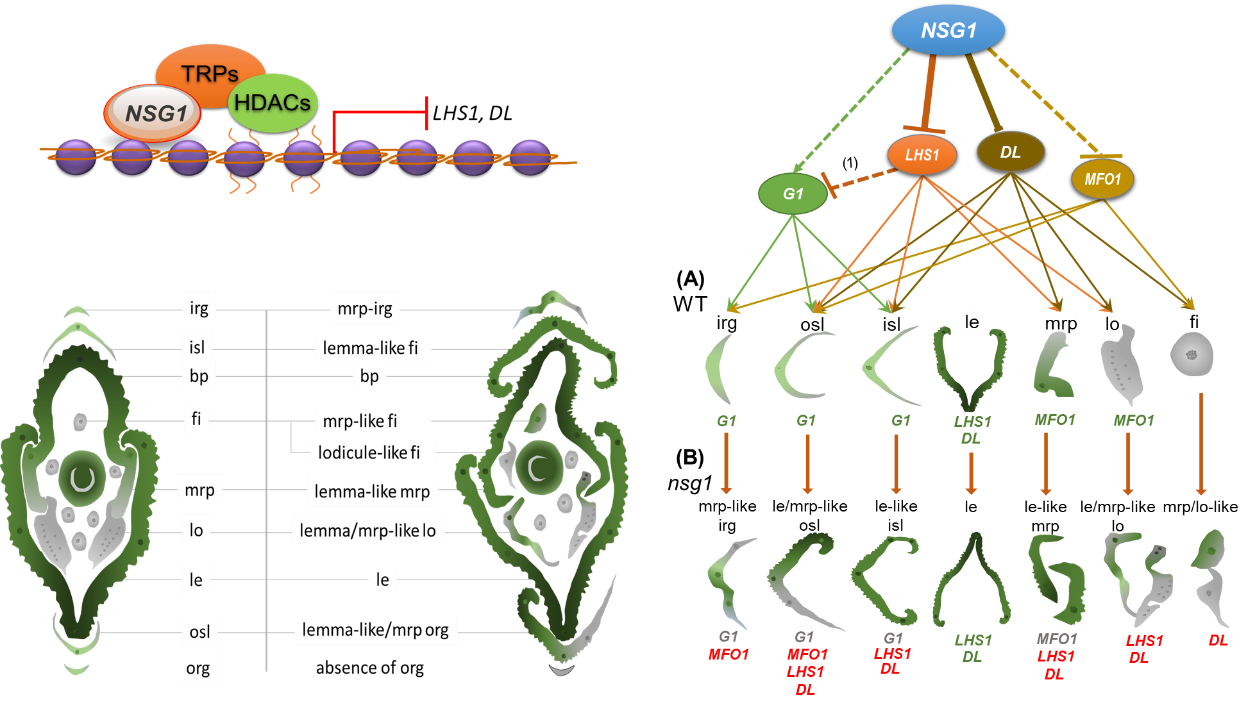 2020年初,团队在顶级植物学期刊《The Plant Cell》发表了题为 “NONSTOP GLUMES 1 Encodes a C2H2 Zinc Finger Protein that Regulates Spikelet Development in Rice” 的原创性研究长文,深度解析了水稻NSG1基因参与小穗器官特征发育的分子机制。1937年提出的“3花小穗”假说认为水稻小穗的两个护颖是由两个侧生小花退化而来,原始水稻小穗可能由三个小花构成,但缺乏直接证据。团队曾在2017年解析了LF1起始小穗侧生小花的分子机制,证实了“3花小穗”假说,明确了一个水稻小穗可以同时结3个籽粒的科学基础(PNAS, 2017);本研究通过NSG1基因功能的解析,揭示了该基因通过抑制LHS1来维持护颖(侧花)特征发育的分子机制,明确了通过组合设计LF1、NSG1和LHS1基因实现有育种价值的“3花小穗”的科学基础(图1)。