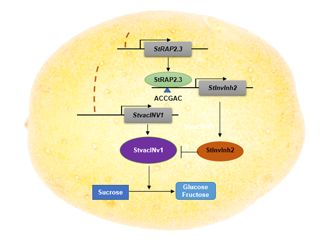 其中从转录调控角度筛选与抑制蔗糖水解途径的转化酶抑制子StInvInh2 协同表达的AP2/ERF VII转录因子StRAP2.3为研究对象。通过凝胶迁移阻滞和双荧光素酶报告系统分析途径,确证StRAP2.3特异结合StInvInh2启动子中ACCGAC元件并激活其表达。进一步利用RNAi技术在马铃薯低温糖化抗性基因型中干涉StRAP2.3,特异抑制了低温贮藏块茎StInvInh2的表达,降低了低温糖化抗性和加工品质。相反,在低温糖化敏感基因型中超量表达StRAP2.3升高StInvInh2表达,提升了低温糖化抗性并改善加工品质。本研究建立了StRAP2.3-StInvInh2调控低温糖化抗性模型,解密了块茎低温贮藏期StInvInh2的转录调节机制,为马铃薯低温糖化抗性机制的研究提供了新的见解,有助于提升马铃薯低温糖化抗性育种进程。