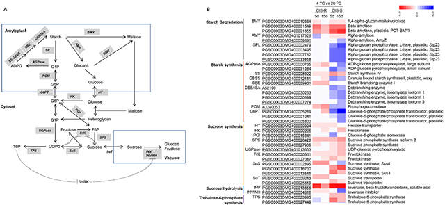 该研究筛选获得马铃薯低温糖化抗感极端资源材料,通过比较低温糖化抗感基因型块茎贮藏期低温应答转录谱,解析了低温糖化抗性和敏感材料块茎淀粉-糖代谢途径选择具有温度环境和基因型依赖性,淀粉降解和蔗糖合成以及蔗糖水解途径是两种材料共同的选择途径,在抗性基因型中促进淀粉合成途径和抑制蔗糖水解途径的选择主要贡献了低温糖化抗性(图1)。