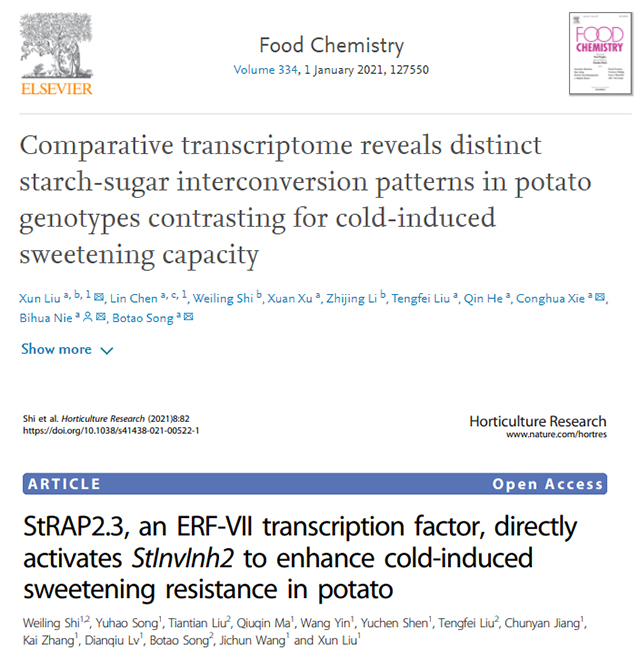 薯类团队与华中农业大学马铃薯团队合作,先后在农林领域TOP期刊Food Chemistry (Q1, IF2020 6.306) 和 Horticulture Research (Q1,IF2020 5.404)发表题为Comparative transcriptome reveals distinct starch-sugar interconversion patterns in potato genotypes contrasting for cold-induced sweetening capacity和StRAP2.3, an ERF-VII transcription factor, directly activates StInvInh2 to enhance cold-induced sweetening resistance in potato 的研究论文。