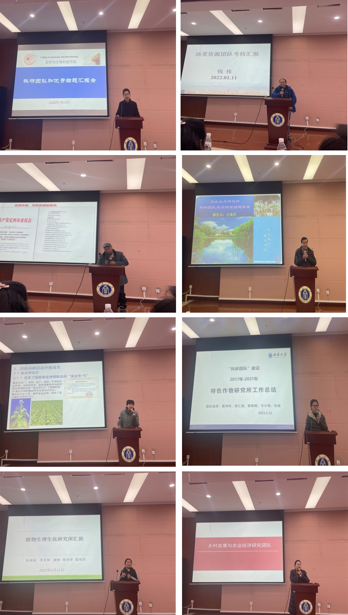 11个团队,水稻研究所、油菜分子育种研究所、棉花研究所、薯类作物研究所、油菜资源研究所、玉米研究所、农业生态研究所、烟草研究所、特色作物研究所、植物生理生化研究所和乡村发展与农业经济研究团队的负责人分别进行了汇报,总结了团队建设与人才培养、科研项目、代表性研究成果、成果推广应用和社会服务、学术交流等情况,剖析了团队存在的问题,并提出了下一步工作计划和设想。
