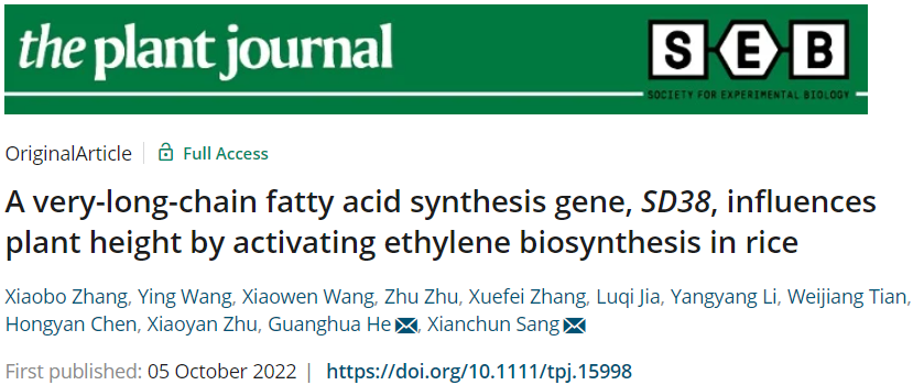 水稻研究所何光华/桑贤春团队在The Plant Journal上发表了题为“A very-long-chain fatty acids synthesis gene, SD38, influences plant height by activating ethylene biosynthesis in rice”的研究论文,解析了VLCFAs通过促进乙烯合成相关基因的表达、进而影响水稻株高的新机制。