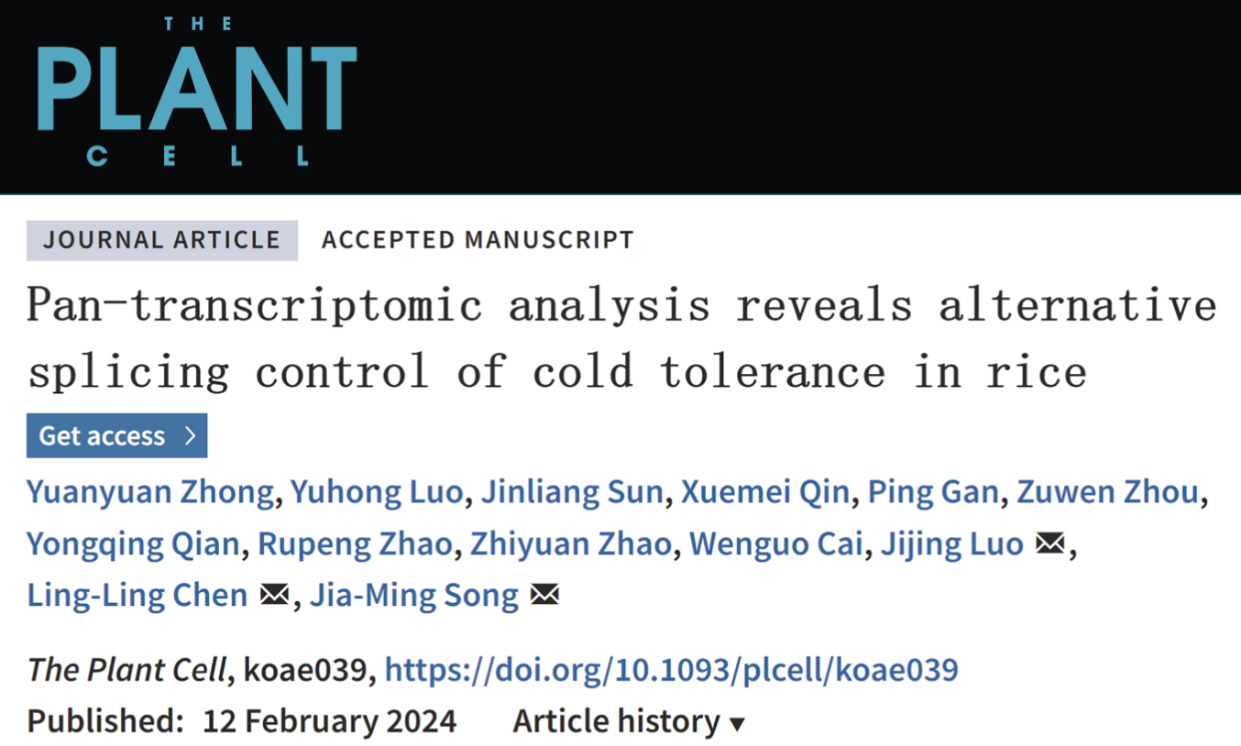 宋佳明研究员和广西大学陈玲玲、罗继景教授团队在国际著名植物学术期刊The Plant Cell在线发表了题为Pan-transcriptomic analysis reveals alternative splicing control of cold tolerance in rice的研究论文,以水稻为模式,构建了泛转录组表征作物响应冷胁迫的转录调控景观,揭示剪切因子的驯化选择参与作物的生态适应性演化。
