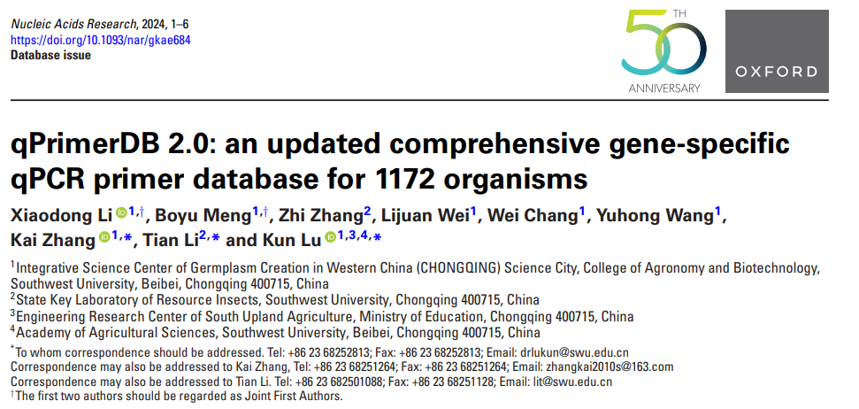 油菜分子育种团队在国际知名期刊Nucleic Acids Research上在线发表题为qPrimerDB 2.0: an updated comprehensive gene-specific qPCR primer database for 1172 organisms的研究论文,推出qPCR特异性引物数据库的2.0版本(qPrimerDB 2.0, //qprimerdb.biodb.org/)。该数据库对2018年qPrimerDB数据库进行了重大更新,最新版本不仅涵盖了1172种生物的基因特异性引物资源,还引入了多项功能改进,显著提升了基因表达研究的效率和精度。
