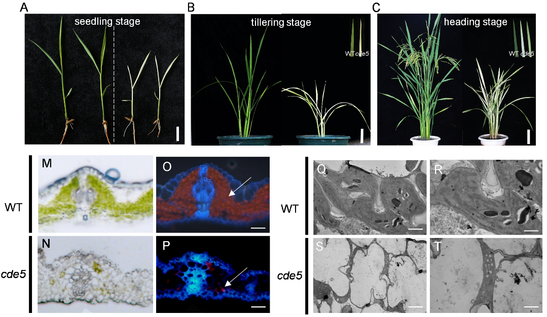 该研究从EMS(ethyl methanesulfonate)诱变突变体库中鉴定到了一个从苗期至成熟期均表现出白化叶片的突变体cde5。图位克隆揭示CDE5编码一个定位在叶绿体和线粒体的DNA解旋酶。其突变导致叶绿体结构严重破坏,类囊体片层消失,叶绿素含量显著降低。DNA解旋酶通常依赖ATP水解驱动双链DNA的解旋。酶活分析显示,cde5突变型蛋白的ATP酶活性极显著降低,表明突变影响了其酶活。此外,转录组及RT-qPCR结果显示,cde5突变体中叶绿体发育、叶绿素生物合成和光合作用相关基因的表达呈不同程度的下调。该研究首次将DNA解旋酶的功能与水稻叶绿体发育联系起来。这不仅对深入了解DNA解旋酶参与叶绿体发育调控的分子机理具有重要意义,还为培育高光效品种提供重要的理论依据。