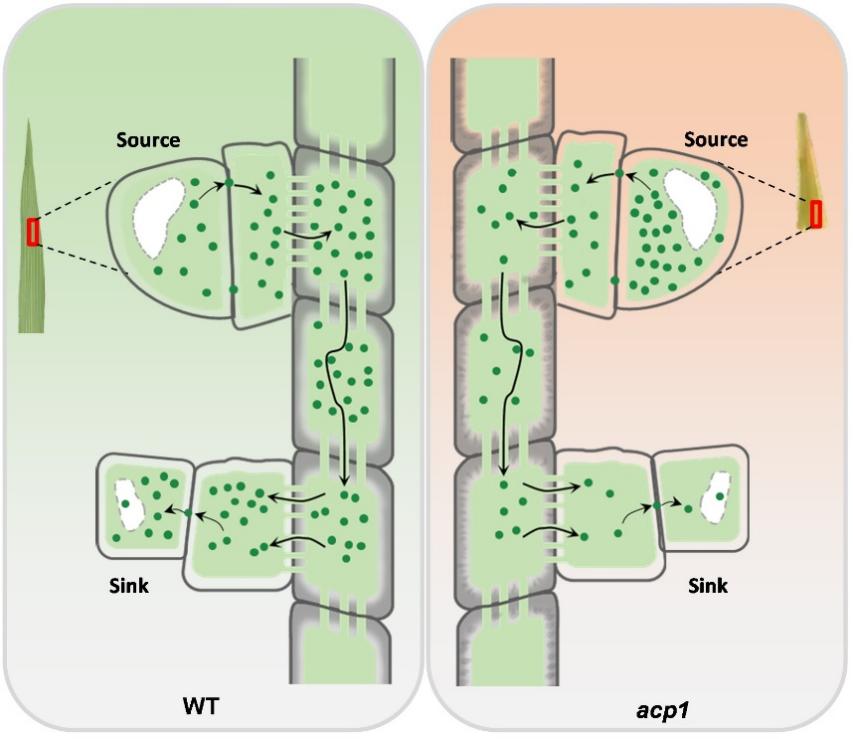 该研究通过对水稻叶片进行淀粉碘-碘化钾染色,根据淀粉与碘反应呈蓝色的深浅变化,从EMS突变体库中筛选出1个叶片淀粉染色变深、光合产物含量显著升高的突变体(aberrant carbohydrate partitioning 1,acp1)。ACP1主要在发育中的维管束中表达。染料负载和糖输出实验表明,acp1突变体的糖转运能力受损。研究发现acp1突变体纤维素合成缺陷,造成韧皮部细胞壁结构异常。进一步研究发现由于细胞壁受损,突变体的膨压下降,无法为光合产物的有效输出提供足够驱动力,最终导致光合产物的输出受阻。本研究揭示了ACP1通过调控细胞壁形成,进而影响蔗糖的长距离运输,为深入理解作物碳水化合物分配的分子基础提供了新的见解,也为作物产量和品质改良提供了潜在的分子育种靶点。
