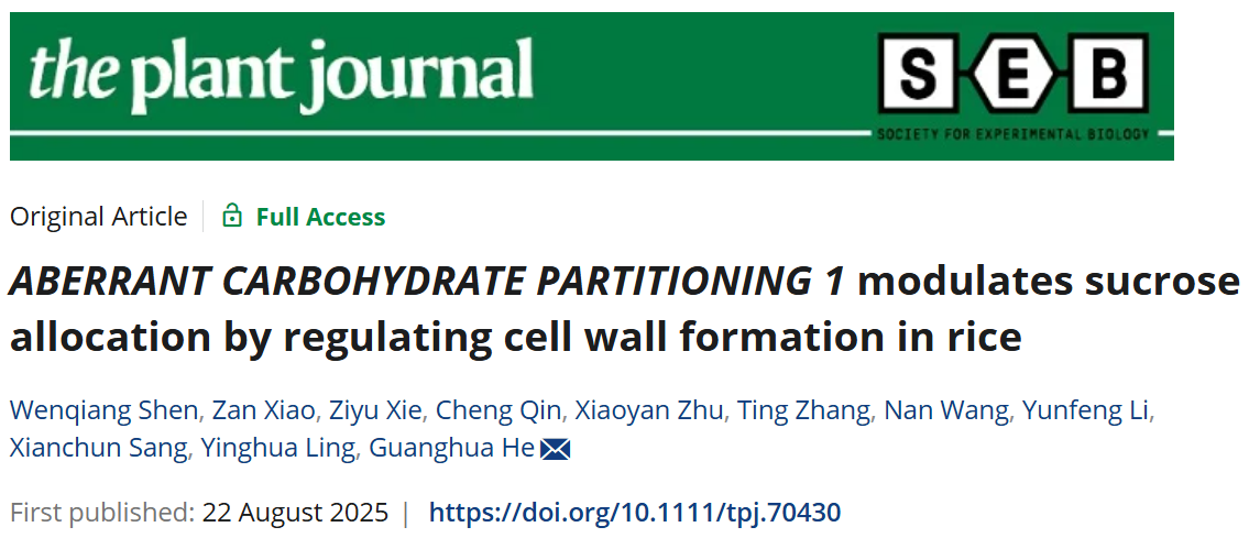 水稻团队在植物学知名期刊The Plant Journal发表了题为“ABERRANT CARBOHYDRATE PARTITIONING 1 modulates sucrose allocation by regulating cell wall formation in rice”的研究论文,揭示了ACP1介导细胞壁的形成调控光合产物运输的分子机理。