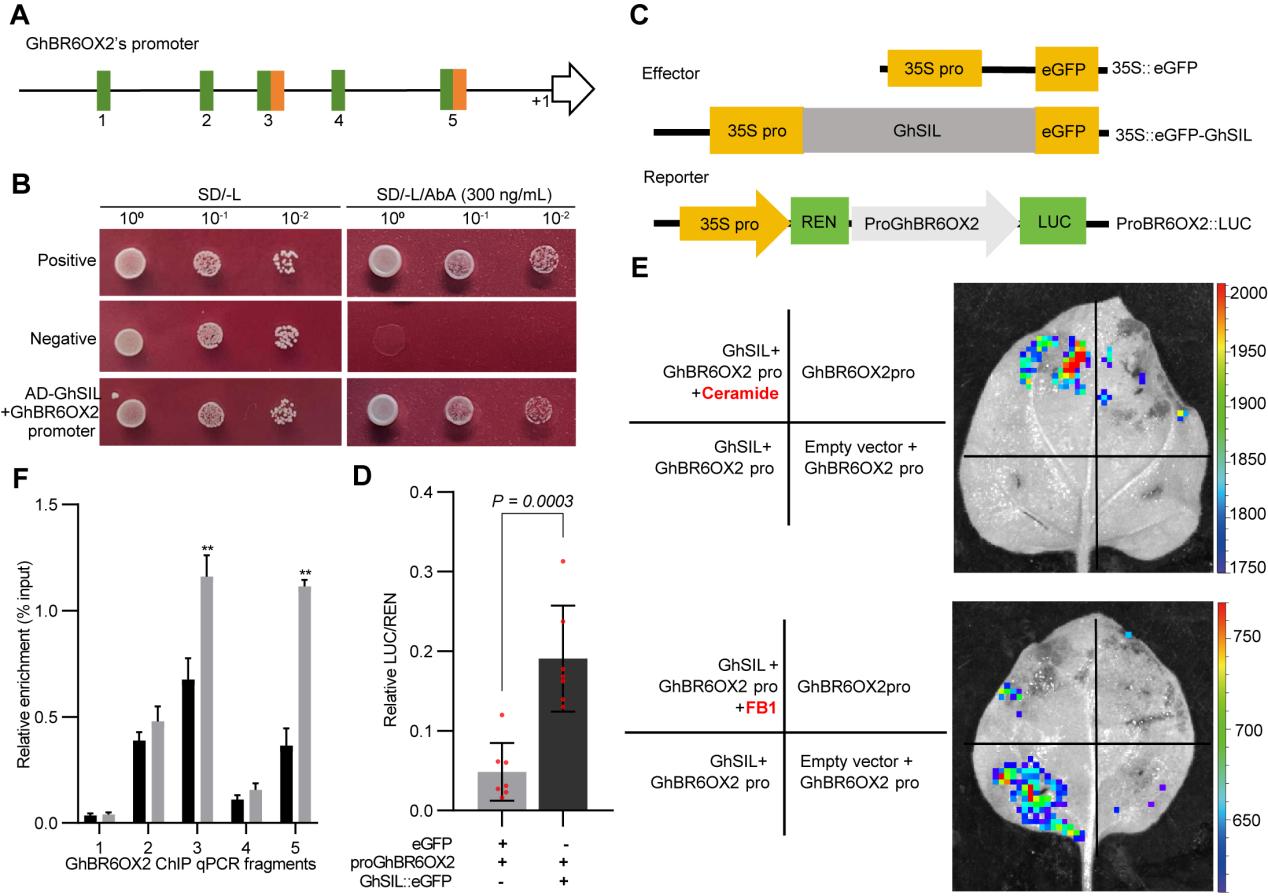 图3 GhSIL结合GhBR6OX2启动子的GT1-box顺式元件并促进GhBR6OX2的表达