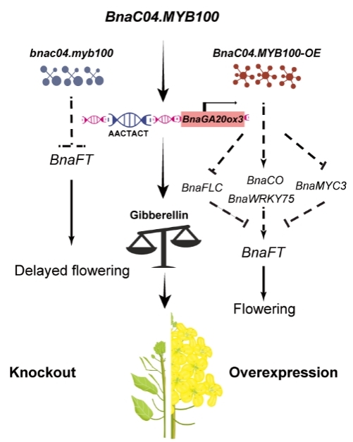 BnaC04.MYB100-BnaGA20ox3模块正调控油菜开花的分子模型