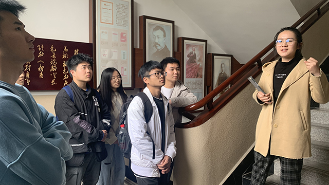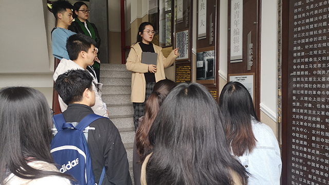 近现代史专业的研究生张慧婷同学为大家讲解。讲解从马克思主义首次在中国被提出开始,结合重要历史人物、重大历史事件、重要历史概念,让大家深刻了解了马克思主义中国化的历程。从马克思主义为什么能在中国得到广泛的传播讲到中国共产党的诞生,从红船精神、井冈山精神、长征精神、延安精神、西柏坡精神讲到抗美援朝精神、雷锋精神、焦裕禄精神,从中共一大会址讲到遵义会议会址,从共产党宣言讲到人类命运共同体,从巴黎和会北洋政府代表(即当时中国政府代表)拒绝在《凡尔赛和约》上签字讲到2020年肆虐全球的新冠肺炎疫情下中国抗疫故事。讲解人沿着文化墙的历史脉络,不断与当今的重大事件相结合,生动的讲解了马克思主义中国化的历史进程。讲解中,张慧婷同学不断回应同学们关切的话题和自己的理论思考,引导同学们认识马克思主义中国化历程中党作出的伟大贡献、形成的理论成果、铸就的伟大精神,深刻领悟中国共产党人百年奋斗历程崇高精神。