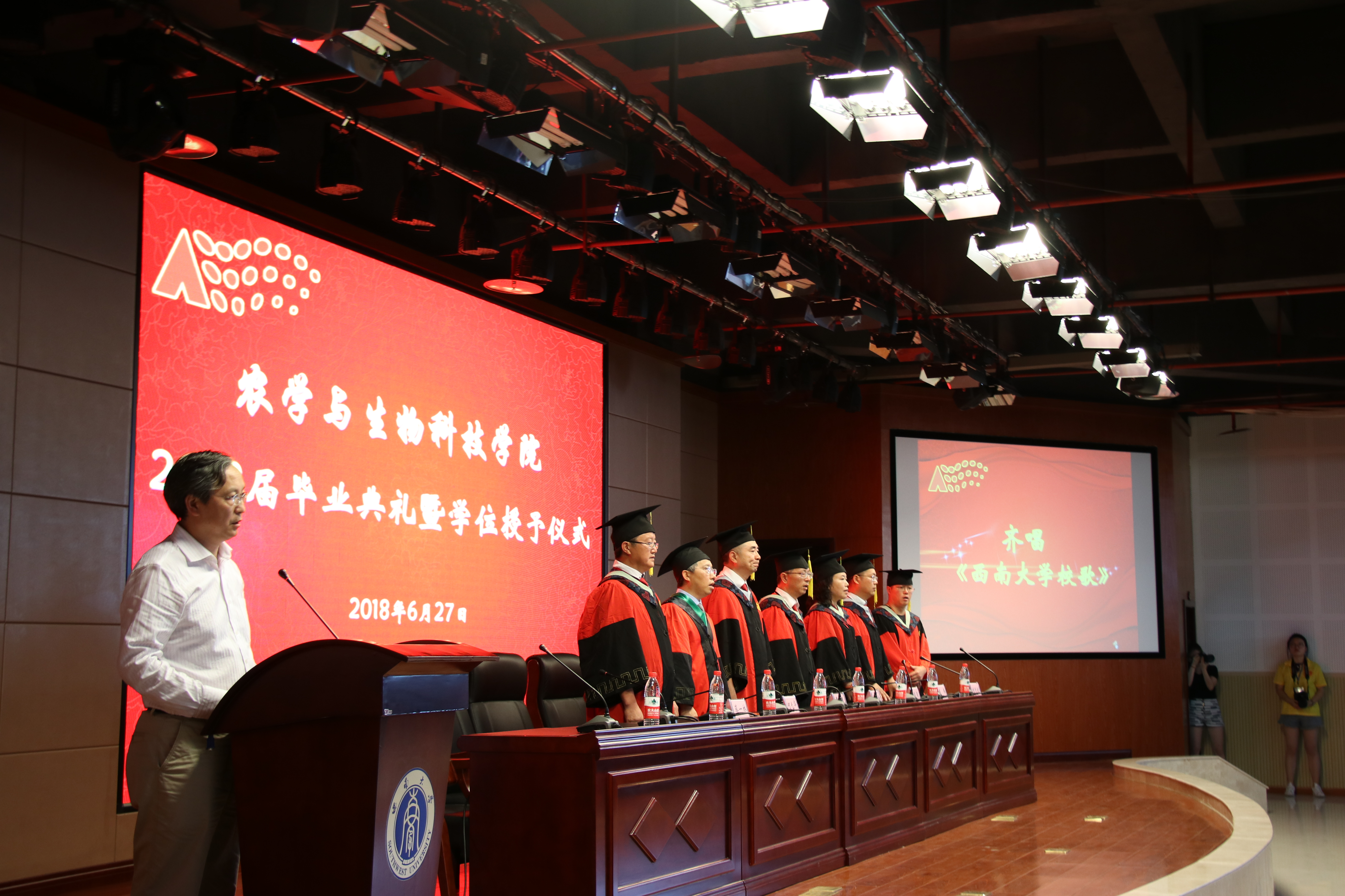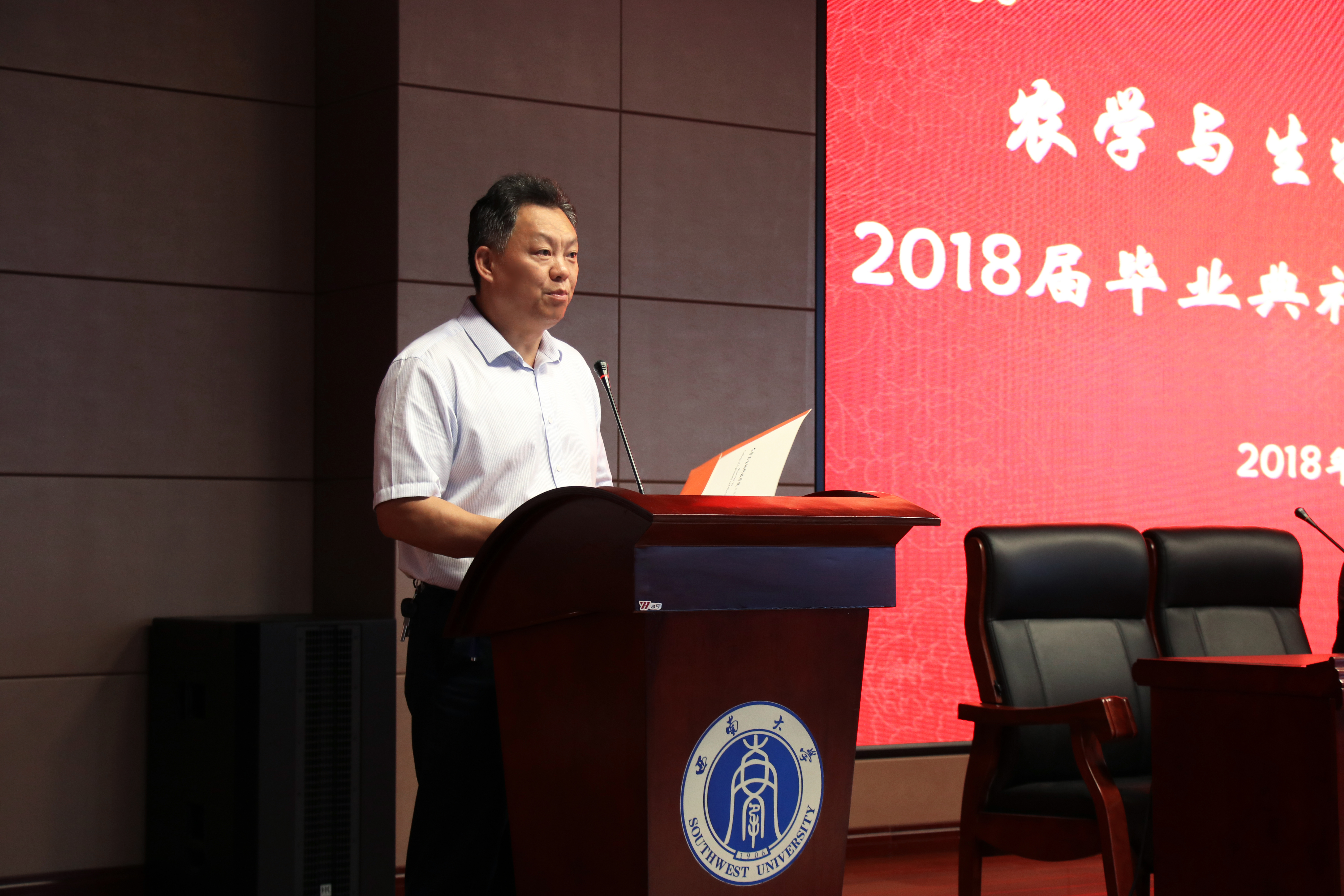 院长何光华教授一席寄语增学子,幽默的言辞中是说不尽的谆谆教诲,让在场学子微笑中含泪。何院长送给毕业生们三个相信:第一个相信,相信学过的一切都有用,念念不忘,必有回响。第二个相信,农生学子会种的不只是田,还有对精神格局的耕耘。第三个相信,人生成长和植物生长一样需要遵循规律。最后,何院长以独特方式,祝福学子,他现场演唱了一首歌曲《记住乡愁》让大家记住西大,记住农生。