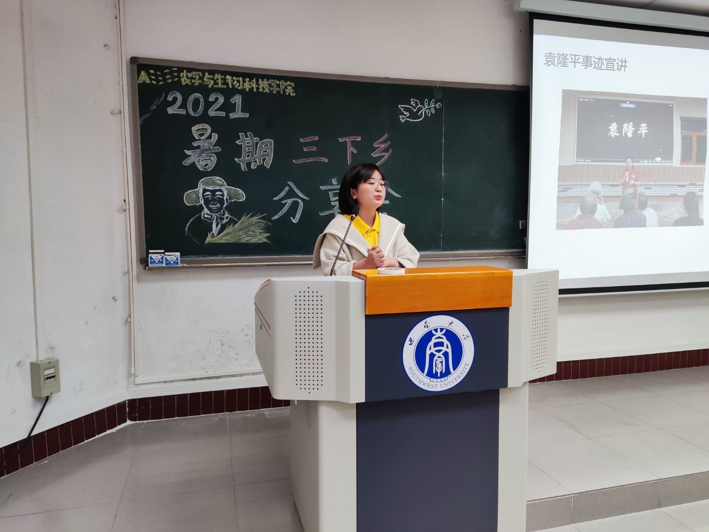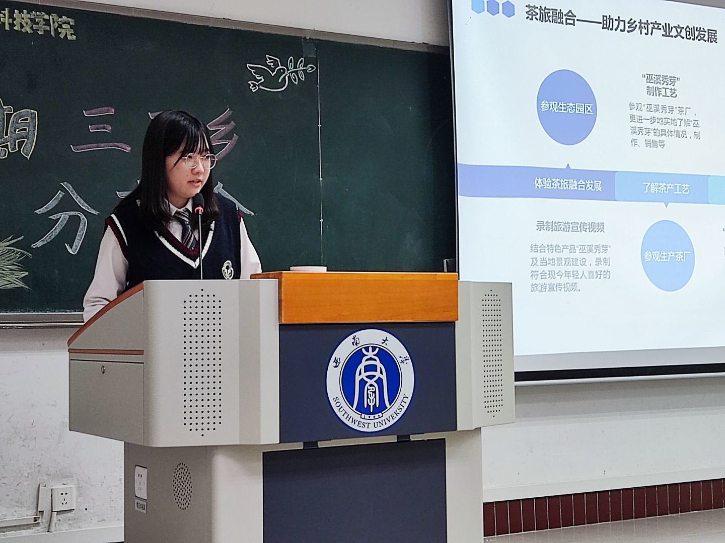 紧接着,6位分别来自二级团组织实践团、校级、院级小分队的代表为同学们分享了他们在“三下乡”活动中的经历、收获和感悟。广州清远小分队成员团结合作,耐心沟通,开展亲子活动,切实增强当地居民的文化积极性,推动当地文化发展,收获了一份独特的经历。重庆长寿小分队成员通过参观当地产业基地,开展问卷调研充分了解当地情况,指出相应问题并给予建议,同时积极开展教育活动,激发了孩子对于科技,文化的兴趣与渴望,在此次活动中得到当地百姓的充分认可,各成员收获颇丰。赴城口社会实践师生服务团到达目的地后首先进行实地考察,适应环境。活动正式进行前多次策划,活动过程中小分队积极开展入户实地调研,充分了解情况,小分队成员以通俗的语言对村民进行技术指导,促进了科学知识的传播,切实为当地发展做出贡献。重庆巫溪小分队各成员分工明确,以实地考察选取帮扶目标,进行文创设计,为当地茶旅融合发展贡献力量,充实了此次实践活动并取得了优异成果。重庆綦江农夫三全小分队以直播的方式给当地特色产业进行推广,为当地特色产业打开了更广的销路。同时,小分队在村干部的积极配合下开展各项活动,活跃了工作氛围,促进了文化发展。小队成员也乐在其中,充实了自己,不虚此行。