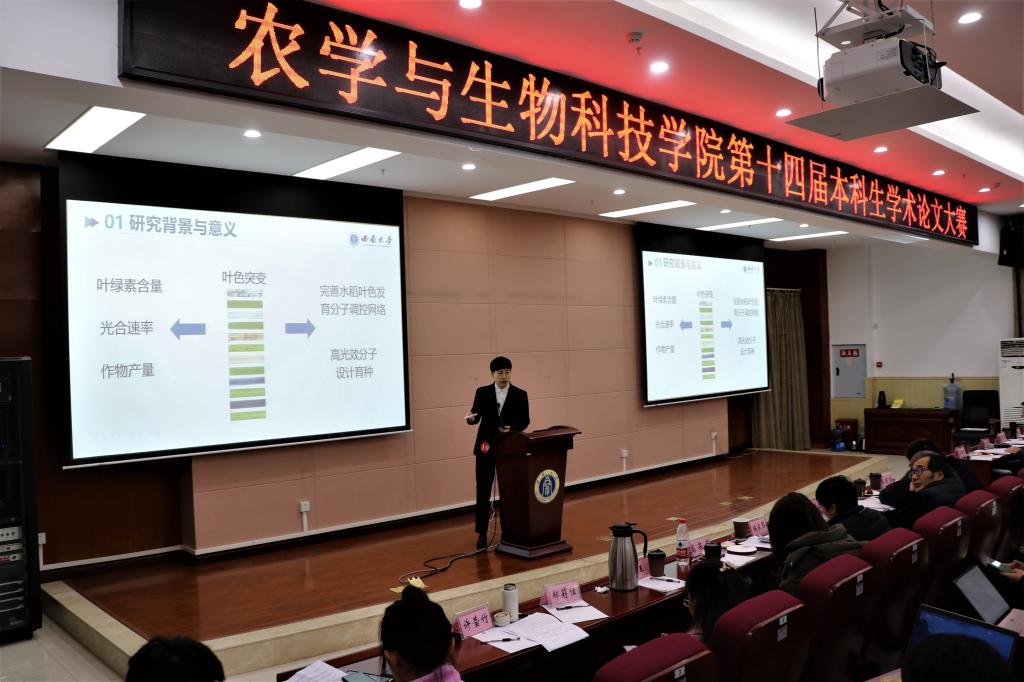 答辩环节由张建奎副院长主持,向同学们介绍答辩规则与流程后,各项目依次进行陈述和答辩。现场氛围紧张严肃,却抵挡不了学子们求知的欲望,各参赛选手思路清晰,有条不紊地对论文进行了深层次的阐述和讲解:水稻、油菜、薯类、紫苏等不同作物的研究、乡村肉类消费因素调研等多方面、多方向、多层次的研究课题,彰显了农生学子发散性思维及广阔的研究视野。简单明了的图表、严谨真实的数据,展现了农生学子严谨求实的科研态度、浓厚的学术氛围和扎实的专业基础知识。评委针对专业理论知识、实验过程分析、标题拟定、未来继续研究的方向等多个方面分别对选手们提问并给出指导性意见,让在场所有同学都受益匪浅,收获颇多。现场思想碰撞、犀利问答,同学们潜心受教,掌声不断。