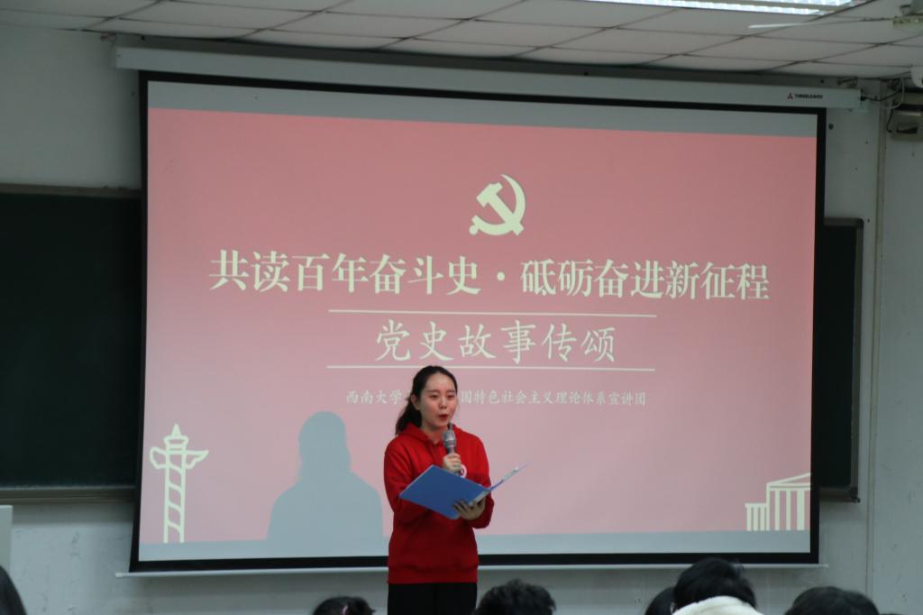 中宣团的刘钰煊同学首先为大家带来党史故事讲述——“置身混沌,探求光明”。她讲述了李大钊先生苦苦找寻能够挽救民族危亡道路的艰难历程,深刻点明了“马克思主义就是中国的救星,只有社会主义才能救中国”的中心思想。中宣团的王夏媛同学,通过“青春热血赴山海”的故事让同学们了解到大学生村官黄文秀书记把一切献给党的热血青春故事。文秀书记曾说,一个人要活得有意义生存得有价值,就不能光为自己而活,要为他人、为社会、为民族、为国家,用自己的力量,努力做出贡献。