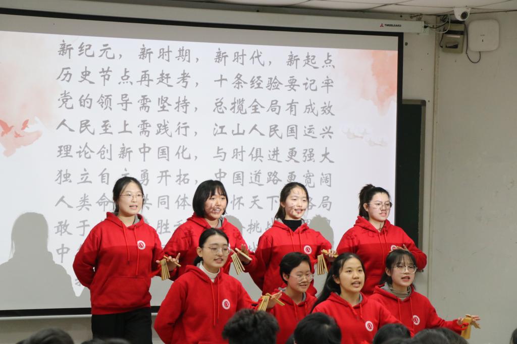 讲座第二部分是由中宣团就党的十九届六中全会精神进行宣讲。通过一段以中国共产党百年述职报告为主题的慷慨激昂的快板舞,使同学们深刻体会到了到中国共产党不破楼兰终不还的决心。党的十九届六中全会在党成立一百周年的重要历史时刻和向第二个百年奋斗目标迈进的重大历史关头,聚焦了一个前所未有的宏大课题,“从党的百年奋斗中看清楚过去我们为什么能够成功、弄明白未来我们怎样才能继续成功,从而更加坚定、更加自觉地践行初心使命,在新时代更好坚持和发展中国特色社会主义。”共同富裕的理想,将在砥砺前行中实现;强军强国的梦想,终将在接力奋斗中成就。