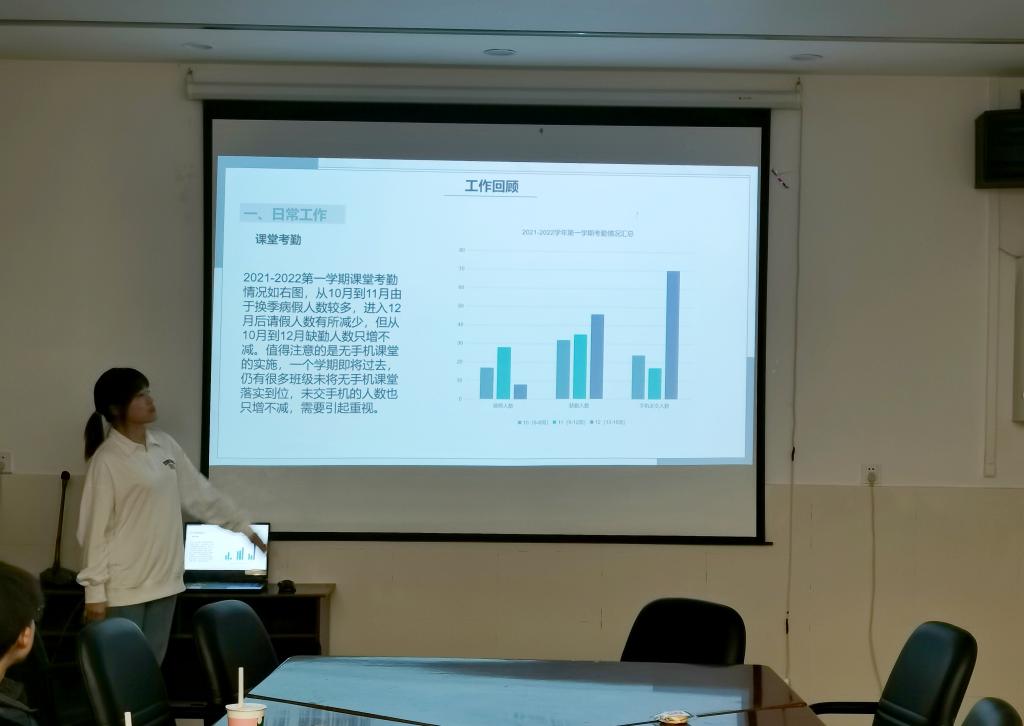 首先,各部门负责人围绕思想引领、成才服务、权益维护、自身建设、对外宣传等方面,依次进行工作述职。述职汇报以PPT展示和演讲的形式进行,既有对工作特色亮点的展示,也有对工作不足深刻总结和下一步工作打算的谋划。体育部在本学期完成了新生运动会、羽毛球联赛、“太阳杯”排球联赛以及“新生杯”篮球联赛中负责选拔、训练等重要工作。学科部在课堂考勤、辩论赛举行、学术论文大赛、笔记评选大赛、“学霸说”栏目建设等工作中取得了一定成效。宣传部负责学生会官Q和公众号的运营以及各活动的宣传,对新闻报道时效性不足等问题进行了反思。组织部在本学期完成了团组织关系转接、“青年大学习”的督促、各团支部“每周一学”活动开展和第九期团校培训班的举办等工作。就业创业部举办了简历大赛和完成了各大创新创业赛事的组织动员工作。办公室在物资管理、财务报账、内部枢纽、对外联络方面为各项活动开展提供了后勤保障。文娱部牵头完成了“植沐风雨 盛世芳华”2021年韩H漫