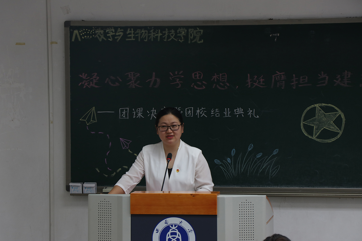 接着,团校结业典礼隆重举行。自2023年11月开班以来,本期团校开展习近平新时代中国特色社会主义思想专题理论学习、志愿服务意识和技能提升讲座、礼仪素养与行为规范提升讲座和学生骨干素养能力分享会等内容丰富、形式多样的课程学习。学员们认真学习、收获颇多。其中刘会兰等14名同学被评为“优秀学员”。来自2023级生物育种科学专业2班的王柳静同学作为“优秀学员”代表发言,她表示在几个月的团校学习中不仅提升了理论修养、增强了技能本领,更收获了成长的自己。号召同学们自觉将个人成长与社会需求、民族命运紧密相连,立志在农业科技创新、农业技术进步、乡村振兴广阔天地争当排头兵和生力军,肩负起“新农人”的时代使命。