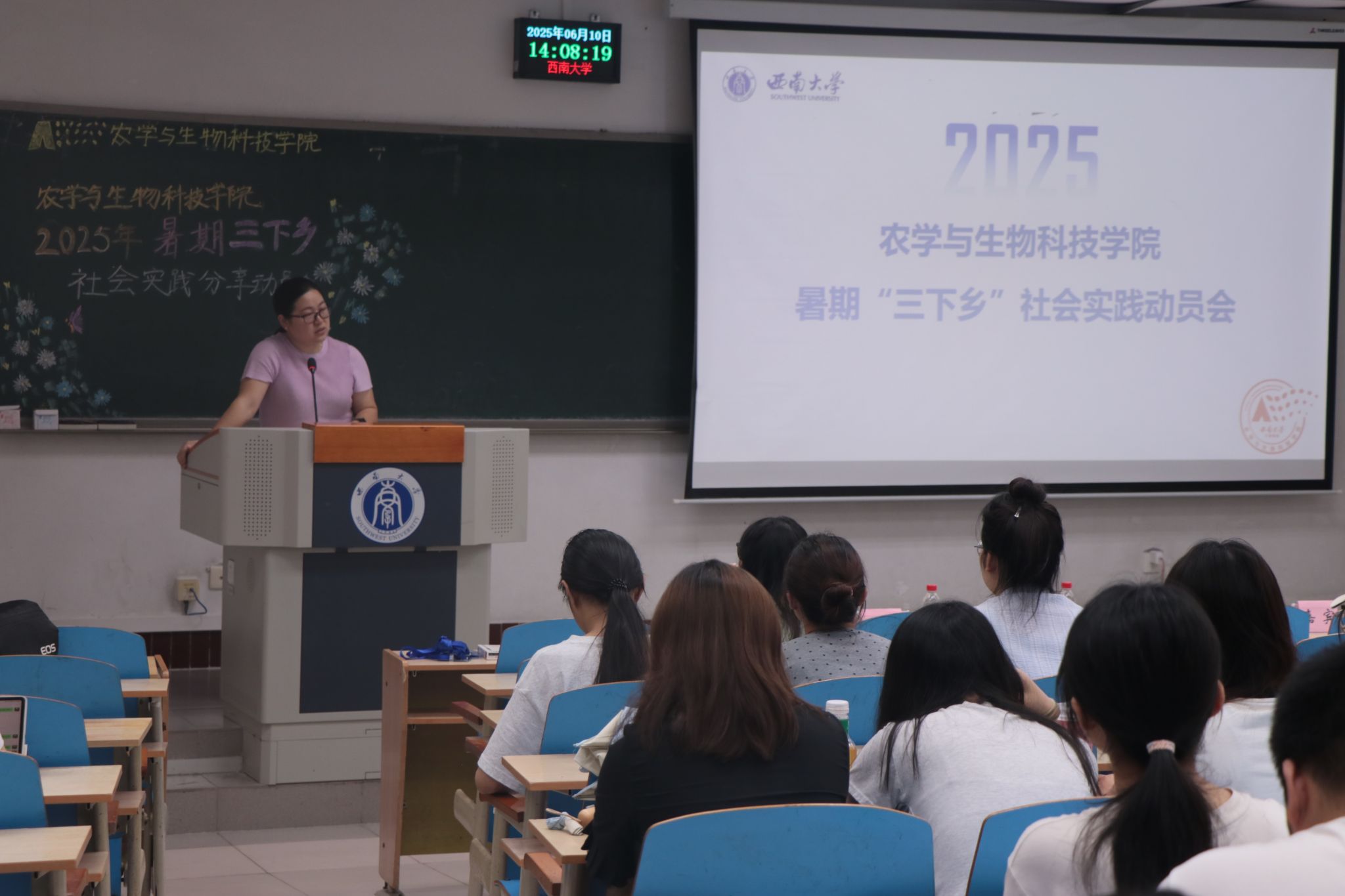 团委书记许莹竹老师作动员讲话。许老师介绍道,‘三下乡’是青年与基层双向奔赴的生动课堂,同学们不仅能深入了解农村的真实面貌,还能在实践中提升能力,感受基层工作的艰辛与价值。针对今年的实践活动,许老师提出三点希望:一是带着“真心”下基层。同学们要俯下身、沉下心,在与群众的交流中了解真实需求,捕捉到他们最迫切的需求和愿望;二是要带着“匠心”做实践。同学们要聚焦乡村发展痛点,用专业知识赋能基层治理、产业升级,运用现代科技和创新思维,设计出切实可行的发展方案,以此提升村民的生活质量。三是要带着“初心”树形象。同学们在工作中要严格遵守各项规章制度,用实际行动树立起新时代青年的良好形象,让青春在无私奉献中焕发出耀眼的光芒。