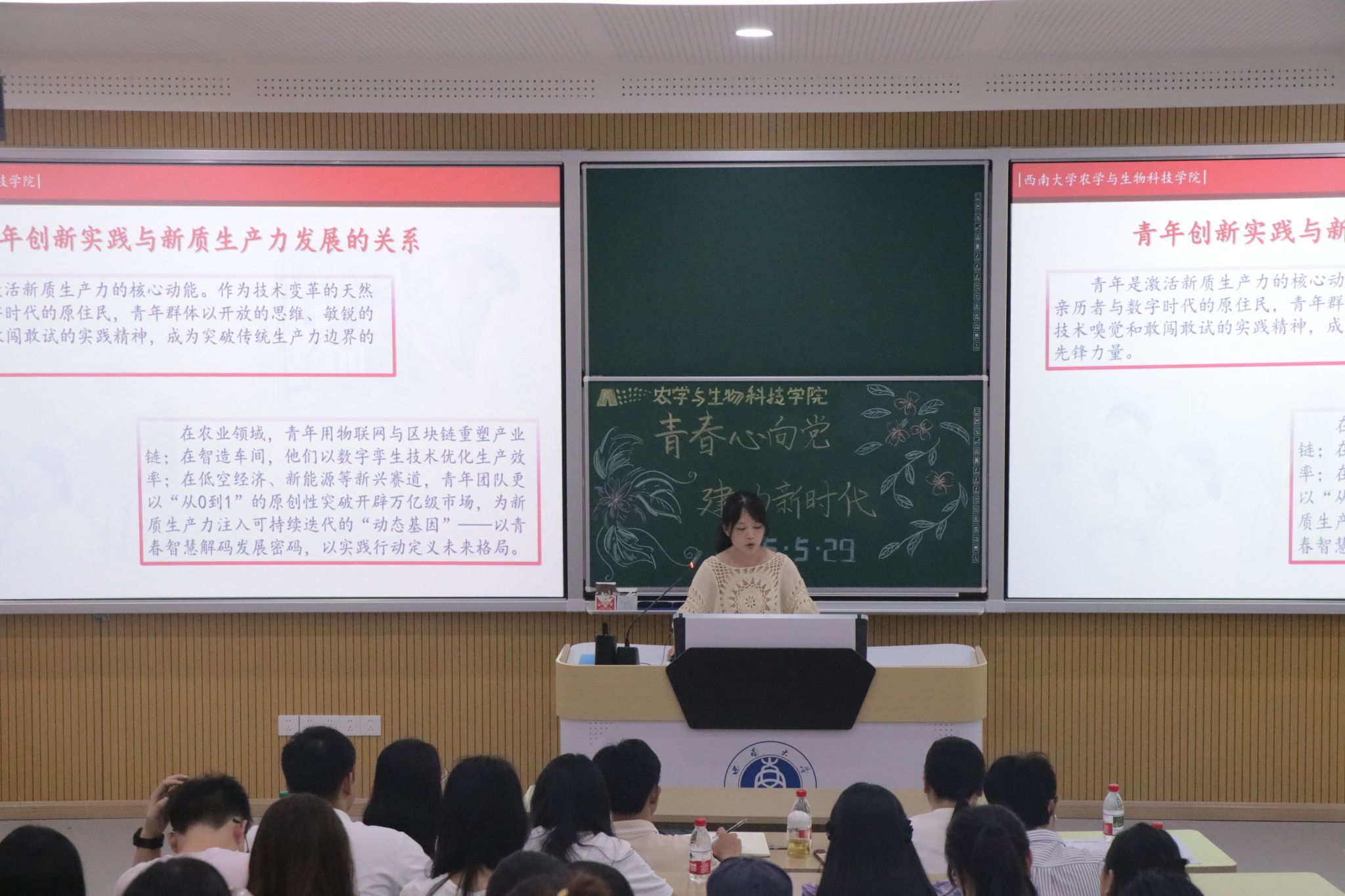 赵蔚晴同学聚焦“新质生产力发展与青年创新实践”,深入浅出地阐述了创新在新时代的关键意义,呼吁同学们要不畏艰难、勇于创新,勇担时代赋予的使命;吴晓同学则以“青衿之志映山河,共筑民族一家亲”为主题,通过生动的案例和真挚的情感,呼吁同学们铸牢中华民族共同体意识,树立正确的世界观、人生观、价值观;范鑫宇同学围绕“团员需要拥有的意志品质”展开论述,引导同学们深入思考如何成为一名自信积极、善于思考的模范团员;王柳静同学以重庆轨道交通“解锁百亿客流,坚持人民轨道为人民”的实例,对“坚持以人民为中心的发展思想”这一主题进行了深刻阐释;陈雨鲜同学着眼于“数字中国建设,青年能力素质提升”,提出将青年共鸣与现代数字议题相结合,能化为照亮前路“三昧真火”的独特见解;向欣同学围绕“‘双碳’目标下,以青春力量绘就生态文明新画卷”,深入探讨了生态文明建设中青年的担当作为;邵嘉琪同学以“播撒绿色基因——农学青年的‘双碳’育种使命”为主题,从多个维度论述了实践与行动的重要性。选手们准备充分,不仅PPT制作精美,内容丰富详实,讲授技巧也十分出色。他们或慷慨激昂,或娓娓道来,用富有感染力的语言和独特的视角,为同学们呈现了一堂堂精彩纷呈、令人印象深刻的微团课,赢得了现场观众的阵阵掌声。