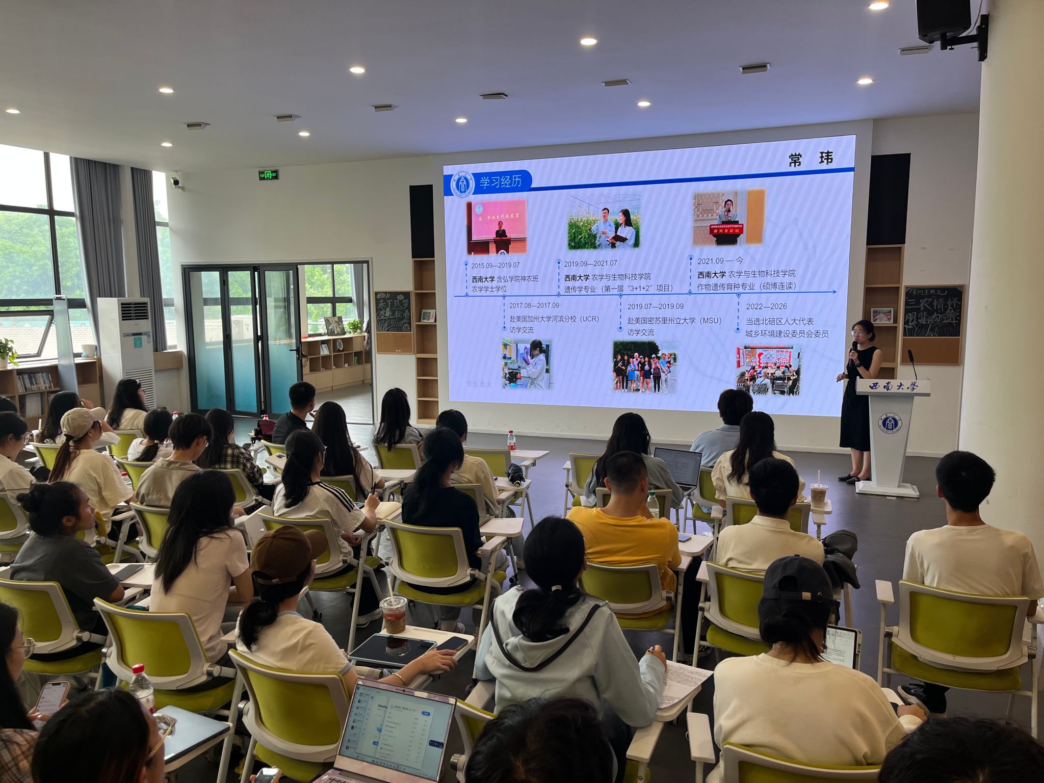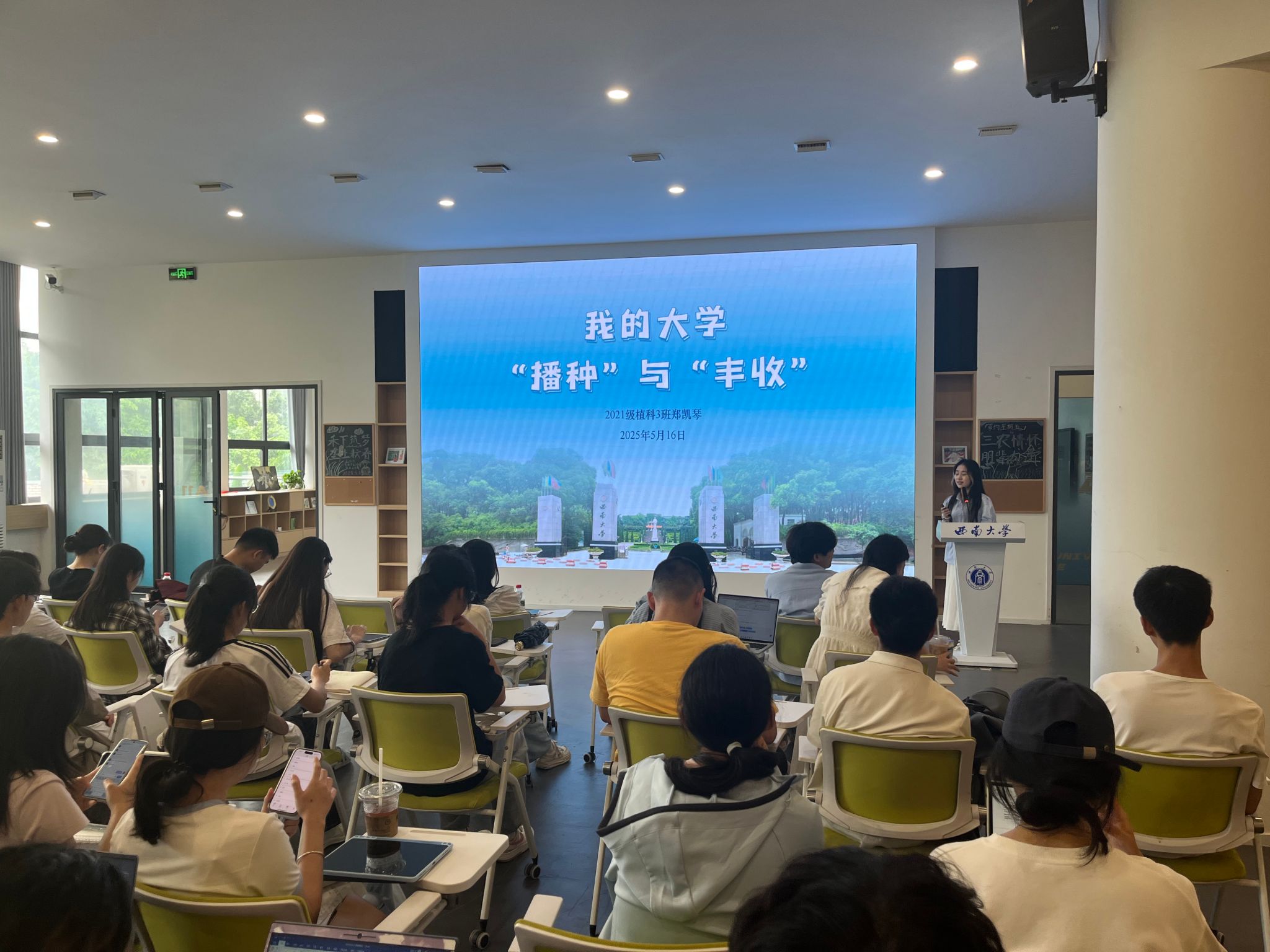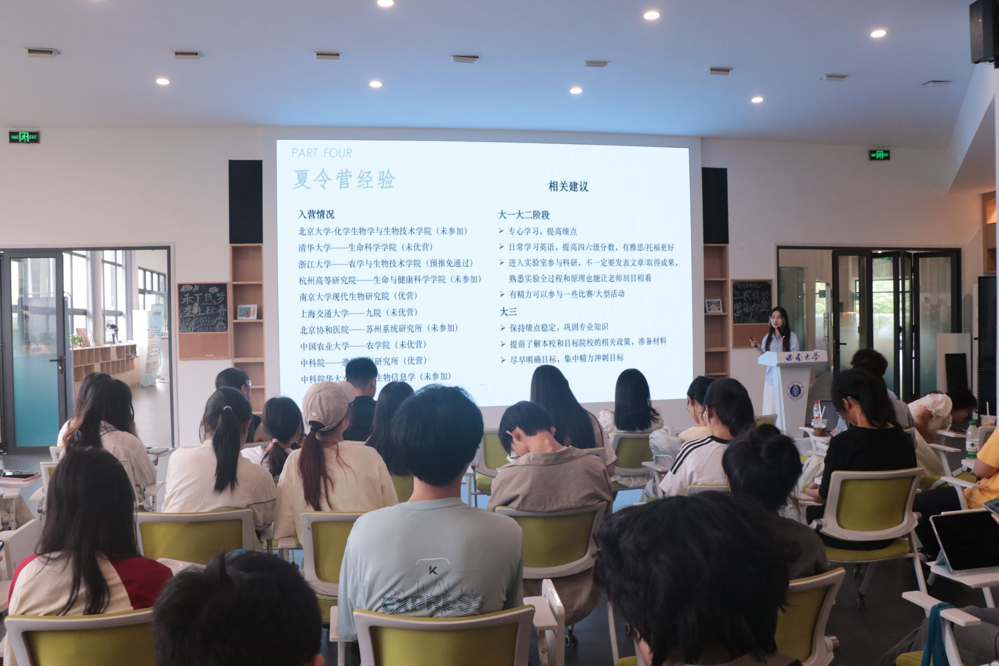 的2021级植物科学与技术专业本科生郑凯琴以“大学生涯的‘播种’与‘丰收’”为主线,向同学们介绍了保送推免的成功经验与学习方法。郑凯琴同学通过分享大学不同阶段的学习重点、选择夏令营的思路、参加夏令营的经历,为同学们提供了全面且实用的经验参考。她指出,“保研不是终点,而是科研生涯的新起点,每个阶段都要清楚‘种什么’和‘怎么收’”,让在场的同学们收获颇丰。