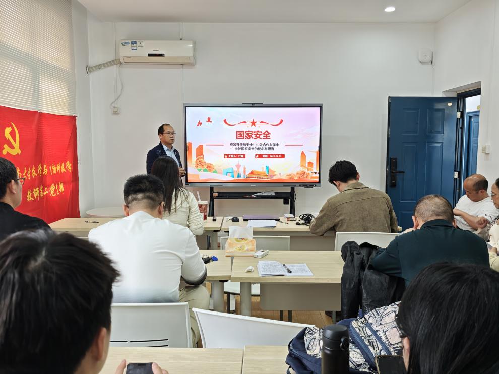 教师第二党支部书记杜海为大家讲授“统筹开放与安全:中外合作办学中维护国家安全的使命与担当”主题党课,他从国家安全的内涵、危害国家安全的行为、维护国家安全的举措三方面对总体国家安全观进行系统的阐述。随后,全体党员分别就总体国家安全观进行研讨发言。