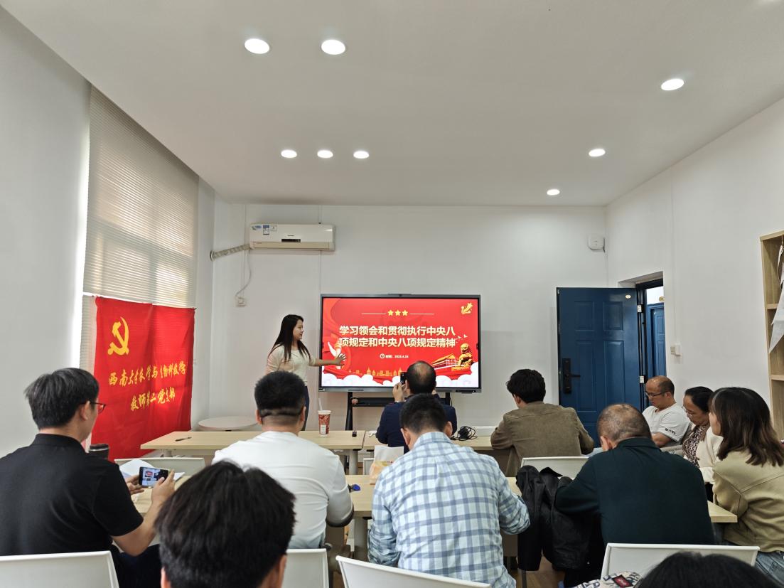 植科党支部书记高荣蓉围绕学习领会和贯彻执行中央八项规定及其实施细则精神进行党课讲授。她向全体党员阐述《十八届中央政治局关于改进工作作风、密切联系群众的八项规定》中有关“中央八项规定”以及“中央八项规定精神”的内容,要求全体党员重点学习其具体细则。