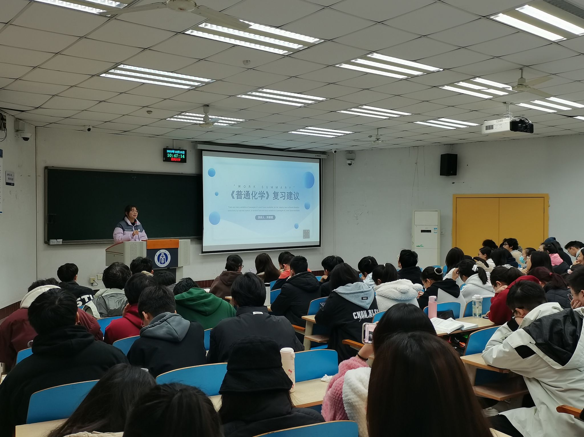 其次,2021级汤杰臻、2021级郑凯琴、2022级郑馨媛、2022级邱杰四名优秀学长学姐分别上台向同学们分享学习经验和方法。汤杰臻同学以自身未学过化学但仍能攻克难关的亲身经历现身说法,为同学们建立自信。他指出,同学们需要保持一个积极的学习心态,相信自己能够在掌握好所学的新内容的同时巩固已学过的内容。他鼓励同学们多去图书馆,自习室等地方,确保学习环境的安静和舒适,有助于提高注意力,将其他无关因素远离学习区域避免受到干扰。郑凯琴同学首先强调了自信的力量,同时提出对自身学习能力和智力的自信,可以减少我们的内耗,从而培养积极的心态。我们不应对课程学习有抵触,而是从中找到兴趣点,以此为我们提供情绪价值,增强我们学习的动力。例如,做对了一道题,听懂了一个知识点,从不落下一节课,得到老师的肯定,都能让我们从中获得成就感,增强学习自信。其次,她鼓励大家找到适合自己的学习方法,而不是一味的照搬其他优秀同学的学习方法。郑馨媛同学建议大家根据考试时间先后顺序安排复习顺序,利用空余时间准备充分,从网上寻找一些有趣的学习内容进行复习,以调动复习的积极性和做题的高效性。邱杰同学着重为大家梳理了本学期期末的重要考点,如有机化合物的命名,各类有机物的反应和方程式,从而帮助大家的复习更加有针对性;另外他也提供了一种高效的复习方法——“珍珠项链”式复习法,根据不同的体系构建主线,再把知识点穿到主线上形成一串学习“项链”。学长学姐们的分享让大家收获颇丰,同学们纷纷表示要学习先进经验,全身心投入期末复习,攻克下大学第一次考试。
